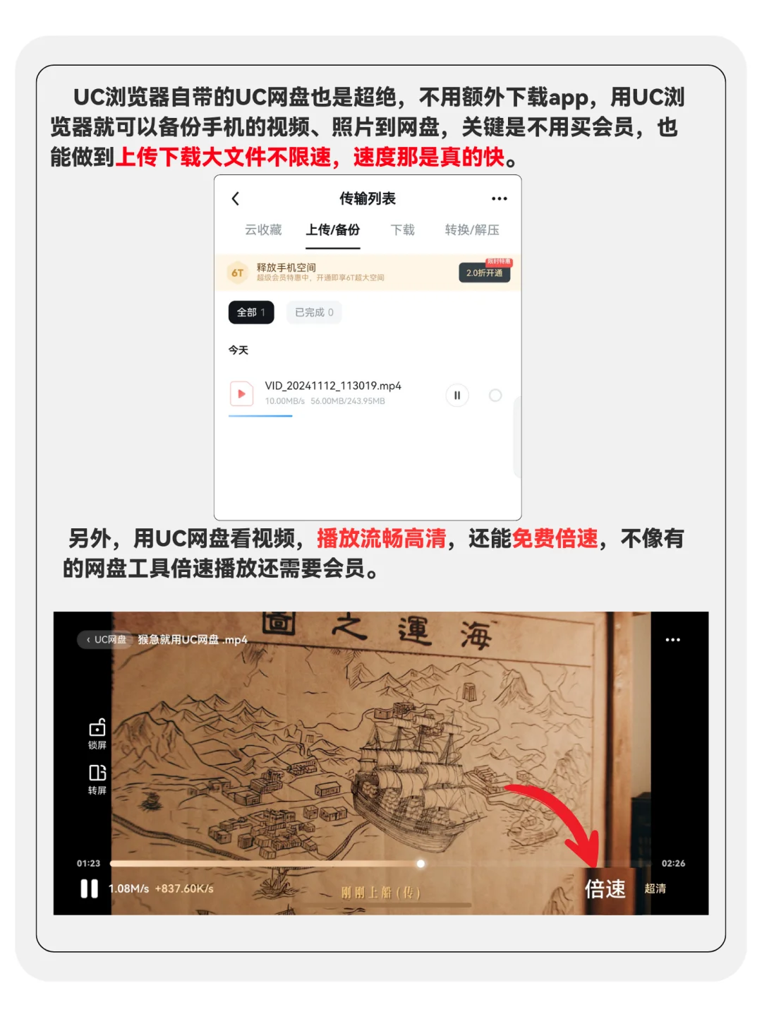 再说说UC浏览器自带的UC 网盘,这可真是个宝藏功能,免去了你额外下载网盘应用的麻烦,非常简单便捷。平常上传下载手机里的大文件,真不限速真的快,就算是非会员也没有限速的烦恼。UC网盘还是个隐藏观影神器呢,用 UC 网盘看视频,高清流畅不卡顿,还可以免费倍速播放呢~[优惠券R]