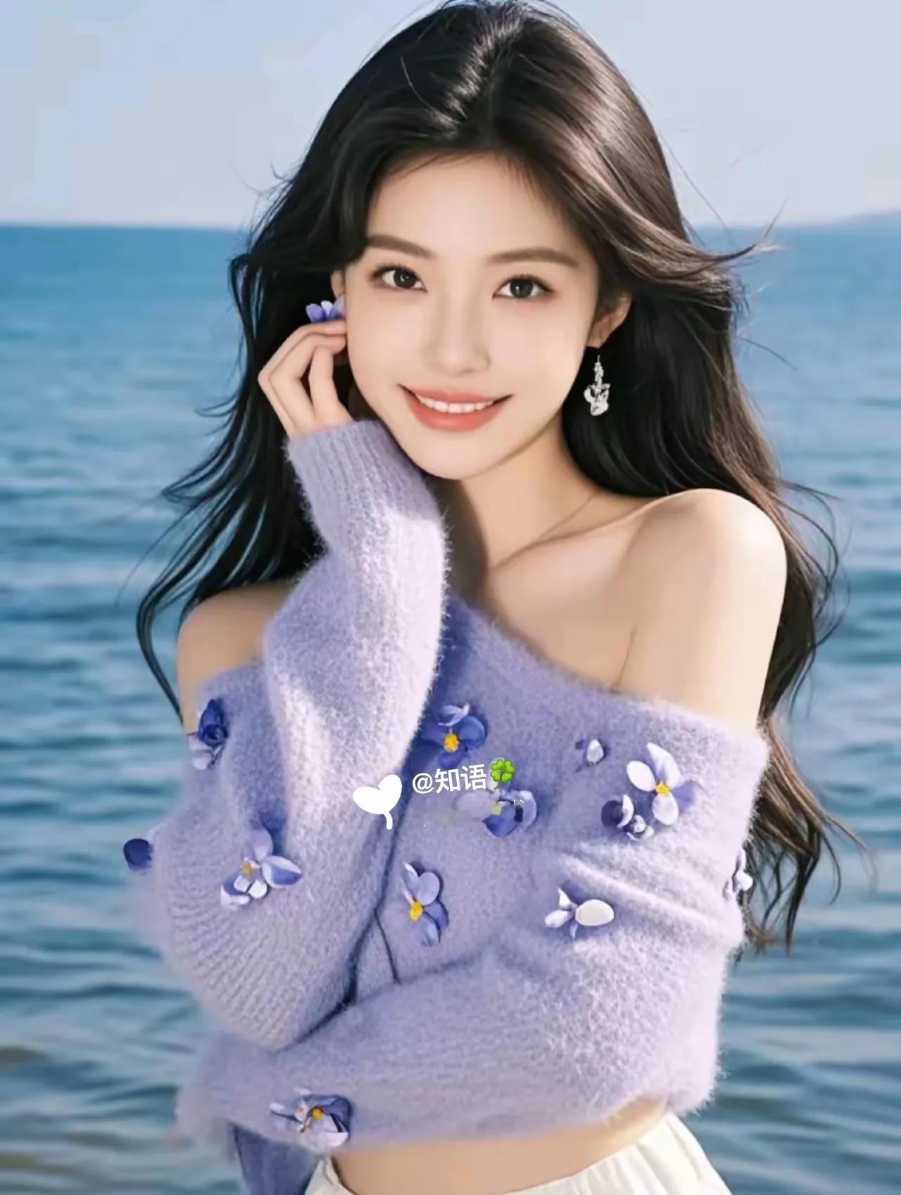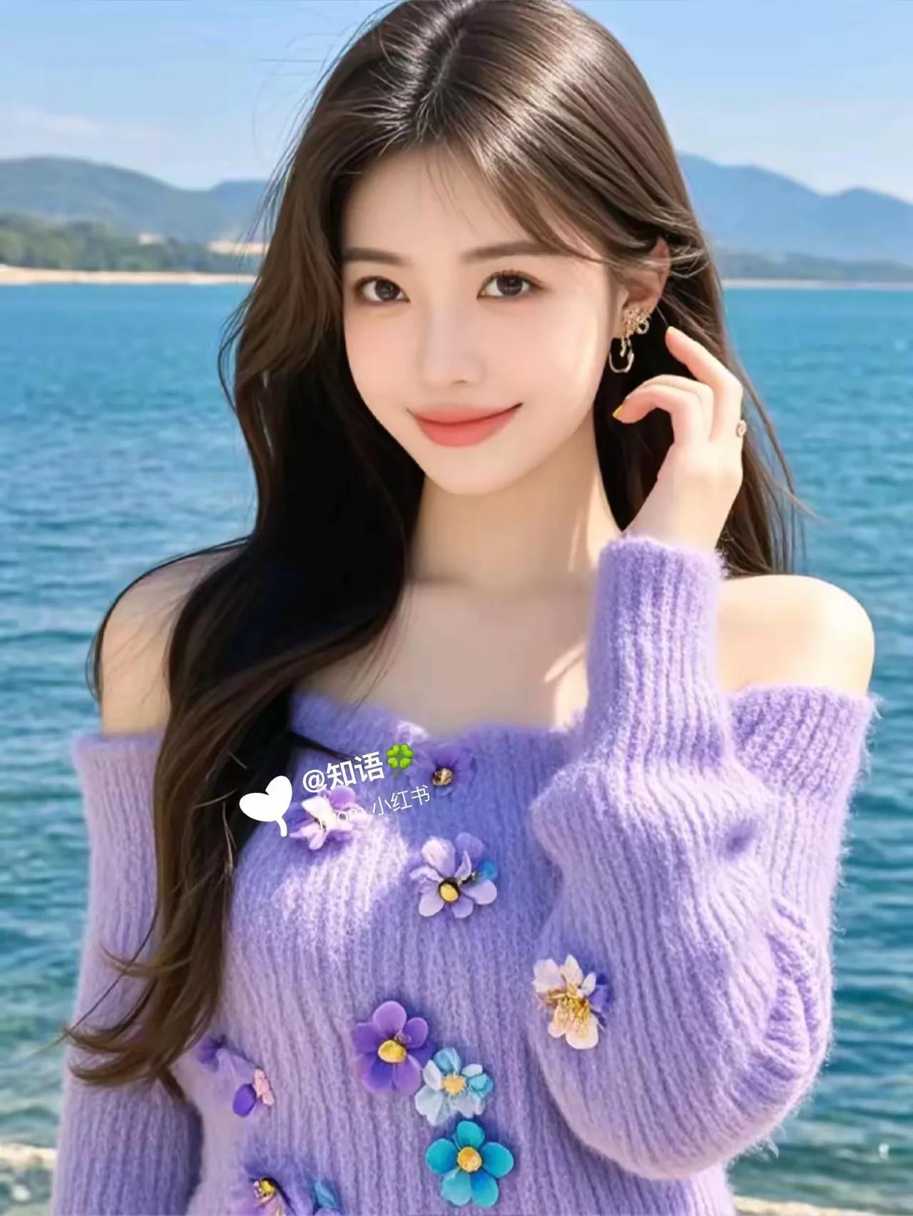 金色的沙滩上,一位美女静立。她身着紫色毛衣连衣裙 ,海风轻拂,裙袂飞扬似云。海藻般的长发随风舞动,在阳光下闪烁着迷人的光泽。她肌肤胜雪,望向大海的眼眸如星辰般璀璨,嘴角微微上扬,似与大海私语,又似沉醉于这无边的美景。