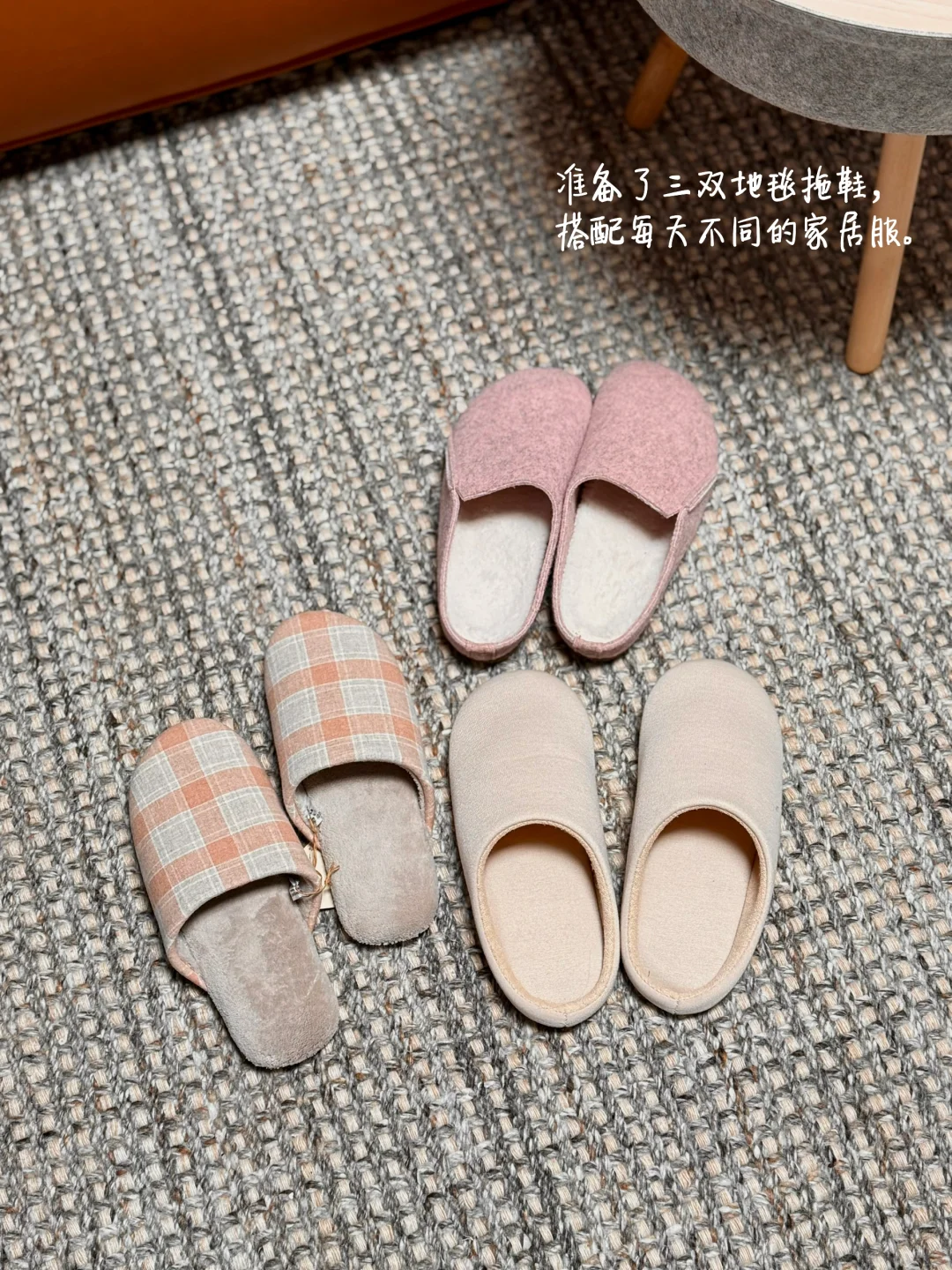 准备了三双地毯拖鞋,搭配每天不同的家居服。