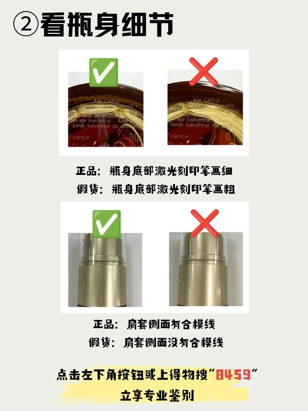 其次看瓶身细节:正品瓶身底部激光刻印笔画细,且肩套侧面有合模线,而假货得瓶身底部激光刻印笔画粗,肩套侧面没有合模线。