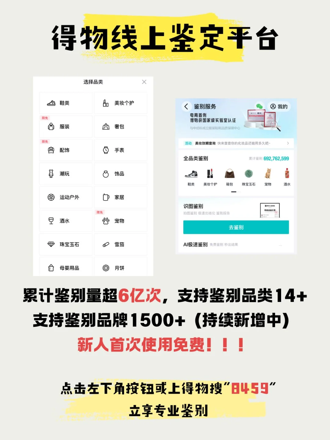 感兴趣的宝子可以点击左下角或得物搜索“8459”,立享专业鉴别服务!新用户首次使用免费哦~