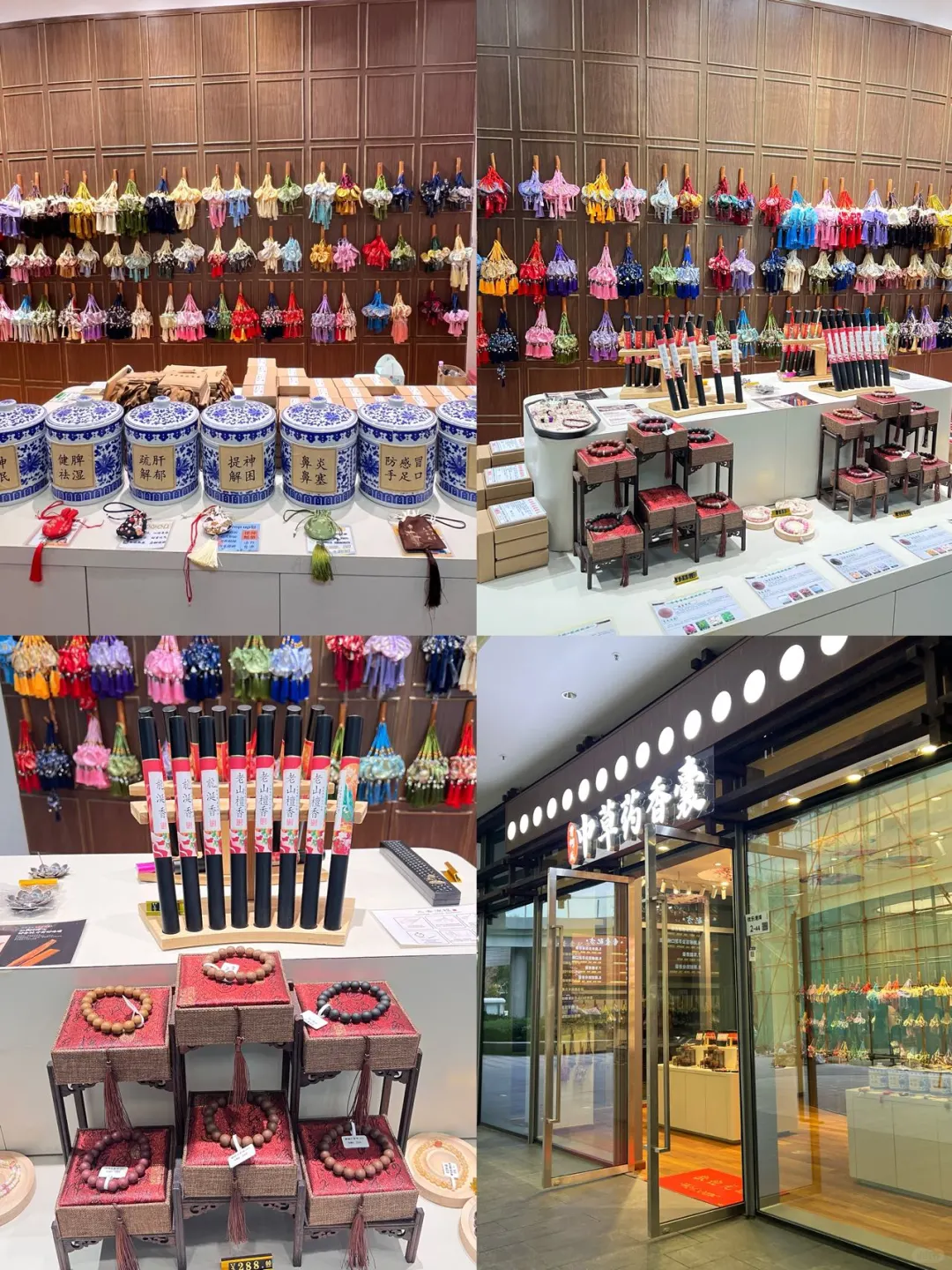 欢乐港湾的这家非遗馆【曹何氏】真的很有意思🤔体验了一把逛胭脂铺子的感觉!一进门就看到制作香囊的香铺,满满的一墙香囊随便选,选好草药现场直接制作,各式各样的安神手串、香,都很不错