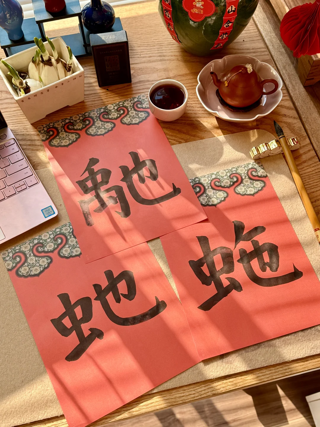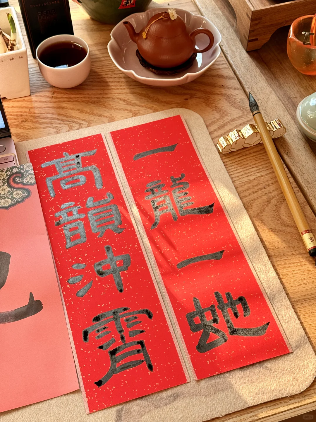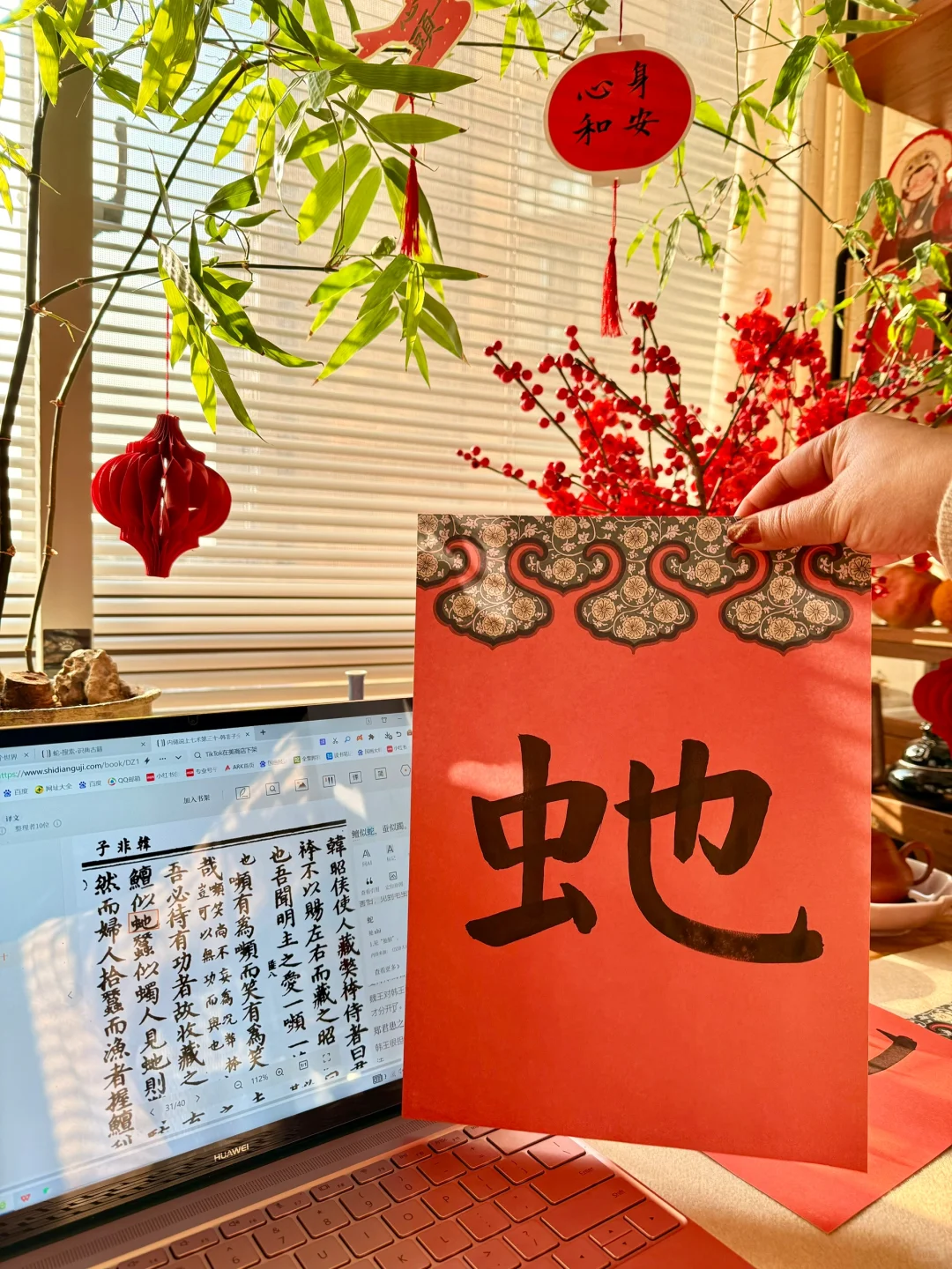 龙年和蛇年交替,就选用“一龙一蛇,高韵冲霄”做楹联。这种自己翻阅,自己提字的书法作品,别有一翻雅趣。
