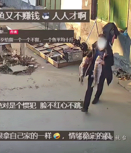 丢人丢大了!一开大奔的男子路过一户人家时,发现这户人家家门口晒了几条大鱼,随即男子竟脸不红心不跳的将这几条大鱼全部顺走了。但这一幕正好被这户人家的监控给拍了下来,而主家一气之下,更是直接将视频曝光到了网上。 监控视频显示,男子穿着得体,期间他很淡定的走到别人家门口,直接拿走了挂在门前的两条大鱼。但走了几步后,男子又转身拿走了剩下的两条大鱼。整个过程,男子都显得非常从容淡定,不知道的还以为这是他家。 事后,主人家发现鱼不在了,查看监控才看到这一幕。而让他更生气的是,这名男子还是一个开着大奔的主。主人家一气之下公布了这段视频,并无奈的表示:好歹给留一个,一个鱼平均十斤啊… 而此事也是引起了网友们的热议。有网友表示:大奔买的起,鱼却买不起,这几条鱼,对不起大奔啊! 还有网友表示:你看这动作,光天化日之下,就像走自家的一样,多从容啊,从这点看绝对是老手。 不得不说,男子这操作实在是太离谱了,话说几条鱼能管几个钱,关键是男子这道德素质也太差了吧。这下丢人丢大了,几条鱼就彻底曝出了他的真实人品,想必以后也不会有生意人再找他合作了吧。 不过正如网友所说,这绝对是个惯犯,偷起东西来脸不红心不跳的。建议主人家将视频证据上交到派出所,对于这种偷窃行为应该严惩不贷,以示警惕!