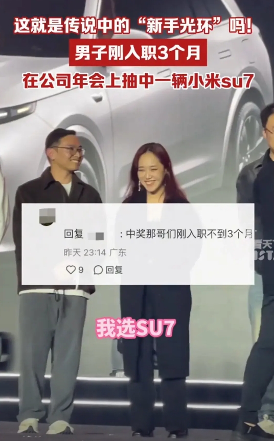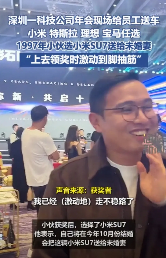 太幸运了!深圳,一小伙入职公司不到3个月,就在公司年会上抽中一辆小米SU7,上台领奖时,小伙激动到脚抽筋,都快站不稳了!