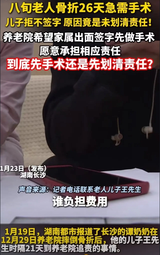 长沙,八旬老人骨折 27 天急需手术,记者劝儿子签字,不料遭儿子回怼:“钱谁掏?”原来,老人在养老院摔倒,儿子要求先划分责任,怕养老院不赔偿。而养老院表示,先给老人手术,否则回错过最佳手术期! 谭奶奶今年 80 多岁了,儿子工作忙,没时间照顾她,就把她送到养老院里。