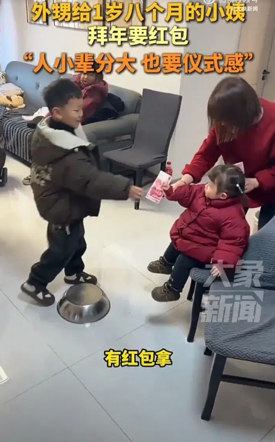 人小辈分大!1月30日,安徽颍上一名网友发视频称,外甥已经上学了,而小姨才一周八个月,外甥看到小姨后,立即跪下磕头索要红包,最后小姨也拿了100元给他,虽然小姨的年龄小,但要有仪式感。 看到这个已经上学的外甥给一周八个月的小姨磕头索要红包的画面,真的令人感到有趣。这个小姨虽然年龄小,但从辈分来说就是长辈,长辈给小辈红包,这也是合情合理的,看着也是十分地温馨。大家怎么看呢?
