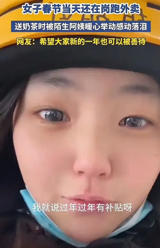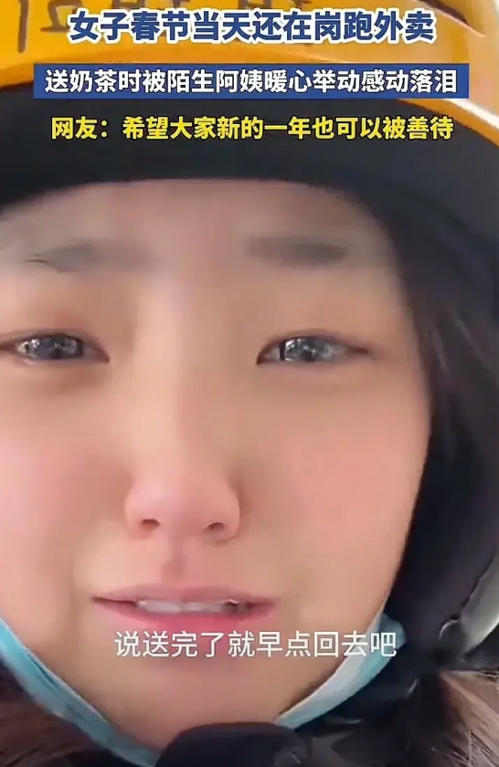最暖心的一句话!除夕当天,一名女子没有回家过年,依然在外面送外卖,当她把外卖交到一位阿姨手上时,阿姨询问怎么没回家?女子回复因为过年有补贴,所以想多挣点钱,这时阿姨拿出一杯奶茶送给女子说,“送完了记得早点回家!” 看到这位阿姨暖心安慰除夕当天还在工作的外卖女子,真的令人十分感动。这名女子非常努力,除夕当天为了能够多挣一点钱,依然坚守在工作岗位,而阿姨也明白她的辛苦,所以才会送奶茶宽慰她,真是善良的人。 大家怎么看呢?