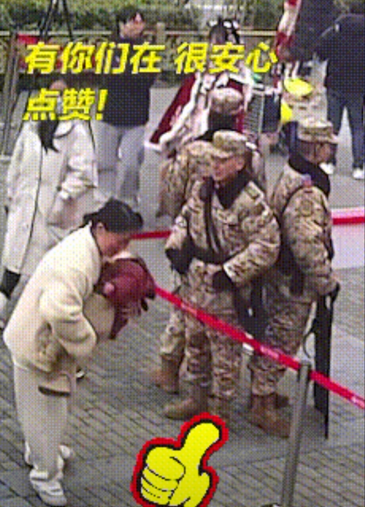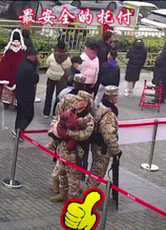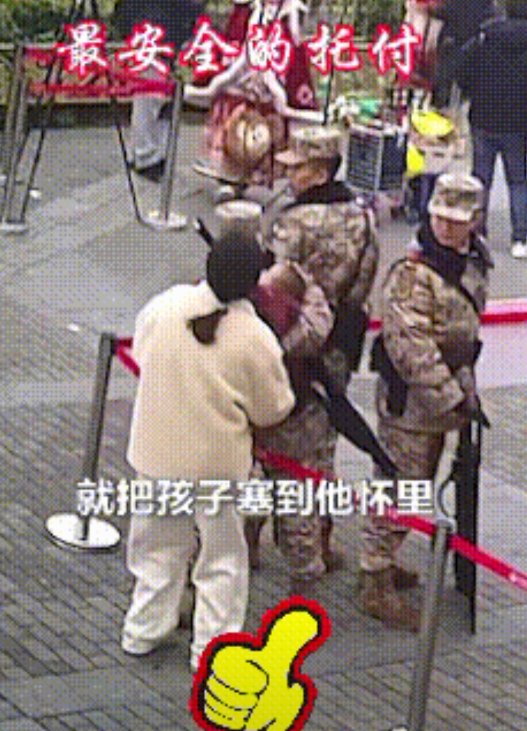 感动与信任! 2月1日,西安钟鼓楼前,武警官兵正在执勤。 一女子因急着去方便,抱着睡着的孩子奔过来,拜托官兵代为照看! 人民子弟兵往那一站就是一座丰碑!你尽可以无条件信任他们! 军人的一接一抱,尽情地展现出军人的担当和温暖,女子递出去的是人民对军人的信任,军人抱的是人民的嘱托,是国家的希望! 军民鱼水一家亲!他们是人民的卫士! 他们是人民最坚强的依靠! 只有中国武警站岗时还得带孩子! 不追网红,不追星,只追人民子弟兵! 看到官兵脸上的微笑,你就知道人一旦做完好事会心情愉悦,百事顺利! 祝国家强盛,人民安康,世界和平!