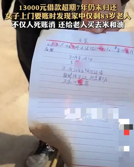“好人一生平安!”云南昭通,13000元欠款要了7年没有要回来,女子春节期间,一气之下拿着欠条跑到对方家中讨要,结果万万没想到,竟然发现对方一家子都已经死了,仅剩下83岁年迈断腿的老母亲、孤苦伶仃!女子看不下去了,不仅直接撕了欠条,还给老人买了些米和油,叮嘱老人一定要照顾好自己!网友:“好人一生平安!”(来源:蓬勃新闻) 据悉,7年前,女子杨某借给王某13000元,双方约定7个月左右归还,到期如不归还,利息就按照每个月3分计算。 担心王某到期不能还款,杨某还让王某给自己打了一张欠条。 谁料,怕什么来什么,到了该还款时,王某以各种理由拖着不还,后来还玩起了“消失”! 转眼7年过去了,因为找不到王某,杨某想着大过年的,王某肯定回家过年,便在春节期间带着欠条,跑到王某家中讨要。 可令杨某万万没想到的是,到了王某家中,仅仅看到一名83岁年迈断腿的老人。细问之下,才知道这位老人是王某的母亲,而王某、王某父亲等人都已经死亡。 杨某的心瞬间软了,出门直接把欠条撕了,而后又不放心老人,去超市买了些米和油给老人送去,叮嘱老人一定要照顾好自己! 该事一时间引起热议,不少网友被杨女士的行为所动容,表示“好人一生平安!” 还有不少网友戏言,如果这是欠银行的钱,肯定就没这么简单了! 那从法律上该如何看待此事呢? 1、欠债还钱,天经地义! 《民法典》第667条规定,借款合同是借款人向贷款人借款,到期返还借款并支付利息的合同。 具体到本案,女子杨某将钱借给王某,与王某建立借款合同关系,王某应当按照约定返还借款。 《民法典》第577条的规定,当事人一方不履行合同义务或者履行合同义务不符合约定的,应当承担继续履行、采取补救措施或者赔偿损失等违约责任。 第676条规定,借款人未按照约定的期限返还借款的,应当按照约定或者国家有关规定支付逾期利息。 王某未在约定期限内还款,已然构成违约,女子杨某作为债权人不仅可以要求王某归还本金,还可以依照约定要求王某支付违约利息。 2、人死并不会债消! 《民法典》第1161条规定,继承人以所得遗产实际价值为限清偿被继承人依法应当缴纳的税款和债务。超过遗产实际价值部分,继承人自愿偿还的不在此限。继承人放弃继承的,对被继承人依法应当缴纳的税款和债务可以不负清偿责任。 法律上并没有人死债消之说。债务人死亡的,仍应当以个人财产为限承担赔偿责任。发生继承的,债权人还可以向其债务人的继承人追偿。 具体到本案,也就是说,王某虽然已经去世,但是杨某作为债权人其实还可以向王某的继承人追偿。 3、但行好事,莫问前程!好人有好报! 《民法典》第130条规定,民事主体按照自己的意愿依法行使民事权利,不受干涉。 可见,只要不违背公序良俗、法律的强制性规定!权利也是可以放弃的! 具体到本案,女子杨某看到王某家的特殊情况,撕毁欠条,免除王某的债务,其实就是放弃自身权利的行为,是法律所允许的。 《民法典》第657条规定,赠与合同是赠与人将自己的财产无偿给予受赠人,受赠人表示接受赠与的合同。 女子杨某撕毁欠条后又给老人购买生活用品,在法律上来说则属于赠与。 女子杨某本是去要账,结果账一分钱没要回来,还又搭进去些钱。女子对此觉得自己问心无愧! 但行好事,莫问前程!好人有好报!很多网友也支持女子杨某的做法,并表示自己遇到同样的事情,也会这么做! 这事您怎么看?如果遇到类似的事情你会怎么做?欢迎在评论区留言,与大家一起交流您的看法!