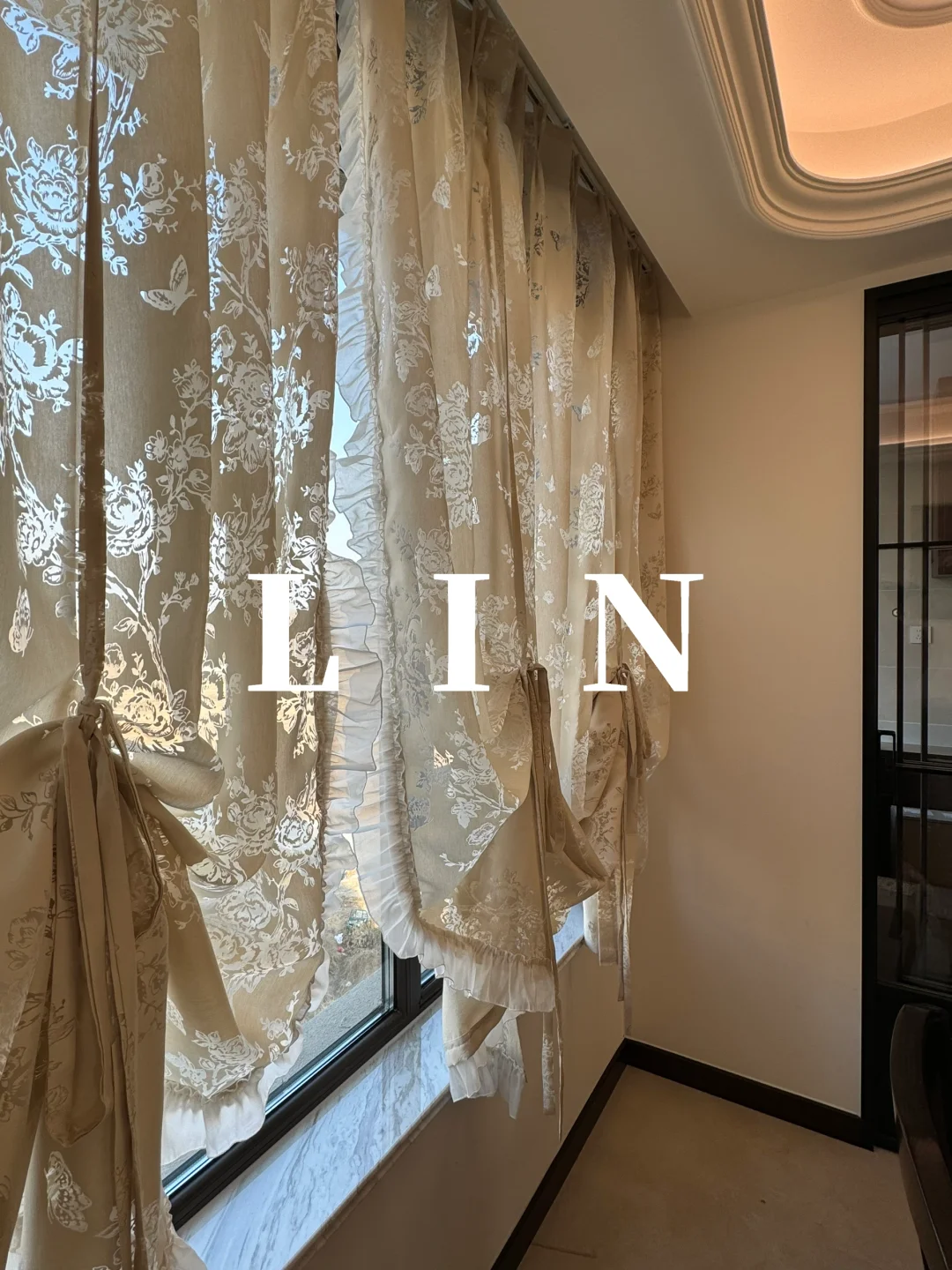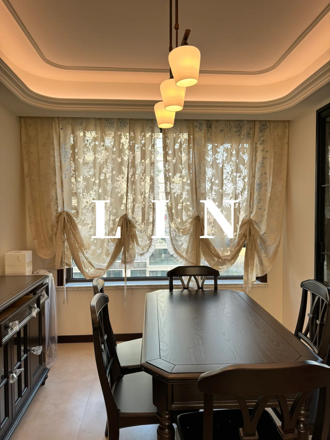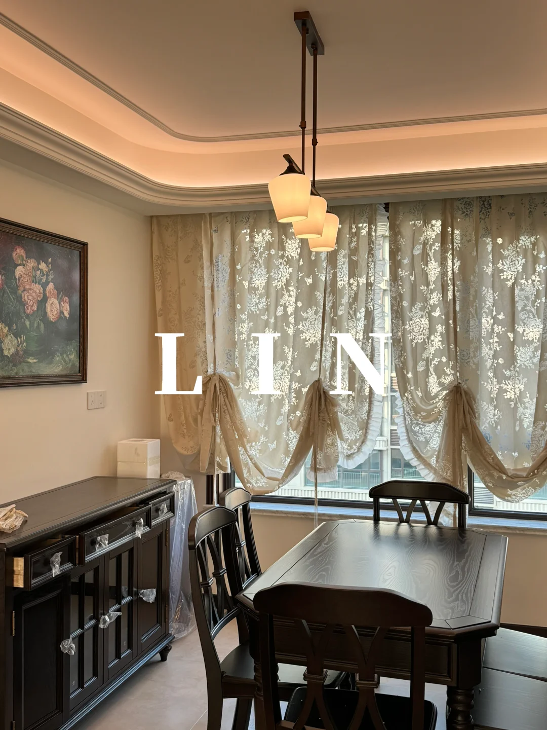 餐厅小窗户不想用百叶窗 可以做光影蝴蝶纱同款提拉帘 温暖浪漫的蝴蝶纱呼应了整体复古的硬装💕 木耳边是整个纱帘的亮点 永远保持少女心啦🎀