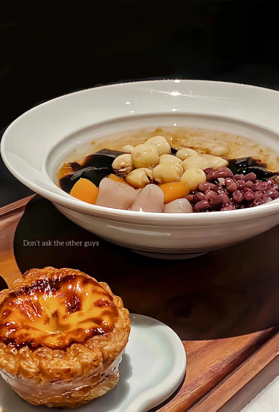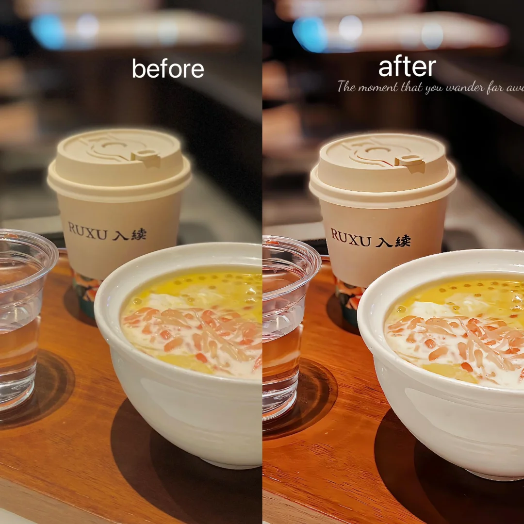 好久好久没有吃糖水了🍮 想念他们家的杨枝甘露了 哈哈哈 💛构图技巧: 1️⃣矮前高后 交错摆放(来 记一下口诀) 2️⃣桌面颜色难看的时候就把食物全部移到桌边缘 垂直构图 减少桌面入画 3️⃣俯拍就找食物甜品交错的位置放大拍 画面丰富饱满 4️⃣一人食菜品少的时候可以手入镜 丰富画面 更动感 5️⃣实在不会拍 就直接开2~3倍焦距怼着拍吧 总能比乱拍好点[暗中观察R] 💛滤镜:🌟图 滤镜-质感-棕咖 光感+10 亮度+15 对比度+30(甜品和背景色差会拉开) 高光+20(亮处更透亮) 阴影-5(背景会暗下去) 色温-5 锐化+70 参数不是固定的 根据实际情况调整 大家注意数据高一点的参数即可 💛质量修复: 针对锐化过后建议用一次质量修复 质量修复后图片会比较清晰柔和 ~~~~~~~~~ ❤️主页会持续更新构图和滤镜❗️