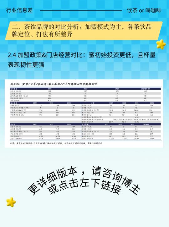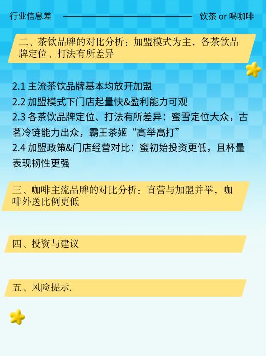 [咖啡R][向右R]咖啡行业:目前现磨咖啡行业竞争格局趋稳且头部品牌优势突出,瑞幸龙头地位有望进一步巩固,公司目前经营表现健康,24Q4 SSSG 进一步改善,且 2024 年 12 月 SSSG 转正,今年有望在开店、量、价表现都呈现积极趋势,看好咖啡赛道。 [流汗R][向右R]茶饮行业:近期头部茶饮企业陆续上市,行业竞争加剧背景下,看好低价格带格局稳定赛道,以及中价格带产品性价比高供应链扎实的企业;建议关注茶饮赛道投资机会。茶饮 茶咖 咖啡 投资 霸王茶姬 瑞幸