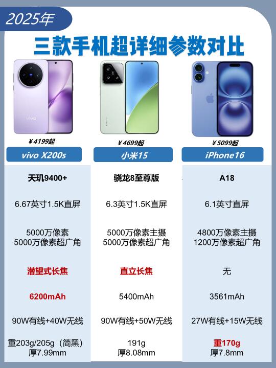 [拳头R]宝子们,手机正值换新季,面对当下热门的vivo X200s、小米15、iPhone16三大机型,你是否也在纠结?今天七七对三大机型深度帮你理清思路! 💡 七七点评 1⃣ iPhone16: - 适合人群:iOS生态忠实用户,偏好轻薄手感 - 优势:A18芯片无诟病,系统ui和流畅以及屏幕都备受好评 2⃣ 小米15: - 适合人群:参数党、多摄爱好者 - 优势:骁龙8至尊版性能拉满,三颗5000万像素镜头覆盖全场景,无线充电速度最快。 3⃣ vivo X200s: - 适合人群:注重续航、拍照多样性的实用党 - 优势:6200mAh超大电池+90W快充,彻底告别电量焦虑;潜望长焦支持远摄,夜景表现更稳。 [自拍R]不过个人看来,追求功能和性价的话比七七推荐vivo X200s,因为除了以上优势,X200s是新款手机,而且新增了苹果流转功能,一碰互传够方便了吧?这次X200s更是打通苹果生态,算是前安卓首款! [向右R]小米15则在小屏和手感占有优势,不过功能没有重大更新,安卓都这么强了建议别等🍎16了 综合来看七七认为vivo X200s是更「一步到位」的选择~