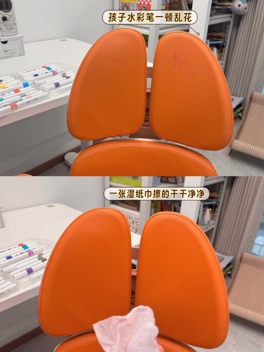 奶油橘🍊清爽耐看,关键是好打理!皮革面防水的,娃撒了果汁、蹭上笔印,湿巾一擦就干净!本洁癖妈妈终于不用跟在后面抢救椅子了!