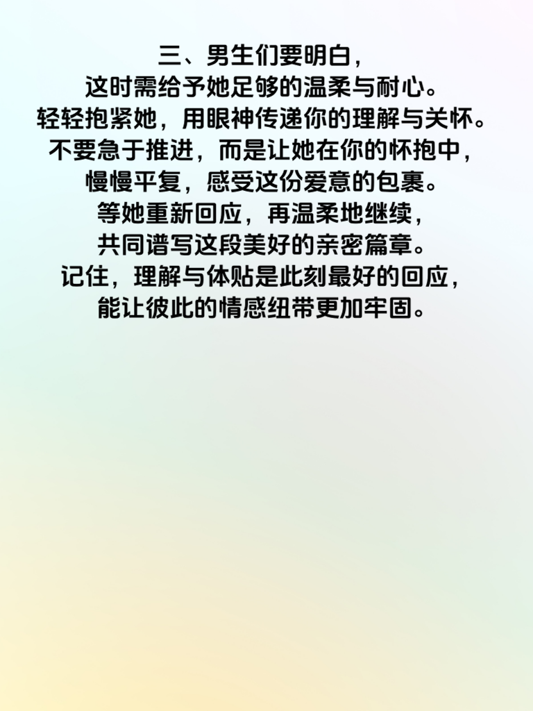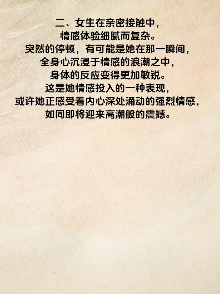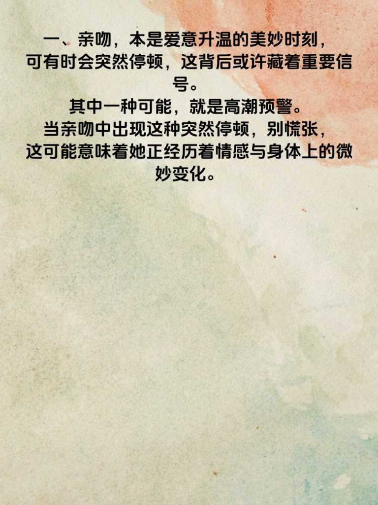 一、亲吻,本是爱意升温的美妙时刻,可有时会突然停顿,这背后或许藏着重要信号。其中一种可能,就是高潮预警。当亲吻中出现这种突然停顿,别慌张,这可能意味着她正经历着情感与身体上的微妙变化。 二、女生在亲密接触中,情感体验细腻而复杂。突然的停顿,有可能是她在那一瞬间,全身心沉浸于情感的浪潮之中,身体的反应变得更加敏锐。这是她情感投入的一种表现,或许她正感受着内心深处涌动的强烈情感,如同即将迎来高潮般的震撼。 三、男生们要明白,这时需给予她足够的温柔与耐心。轻轻抱紧她,用眼神传递你的理解与关怀。不要急于推进,而是让她在你的怀抱中,慢慢平复,感受这份爱意的包裹。等她重新回应,再温柔地继续,共同谱写这段美好的亲密篇章。记住,理解与体贴是此刻最好的回应,能让彼此的情感纽带更加牢固。