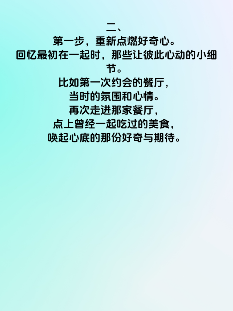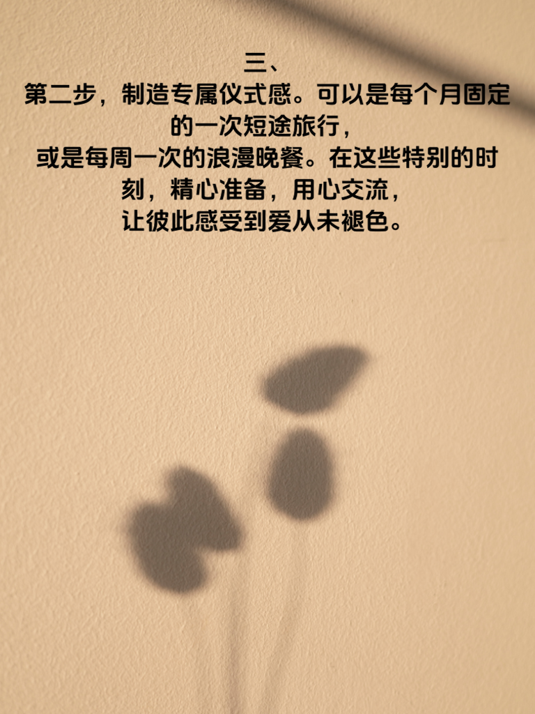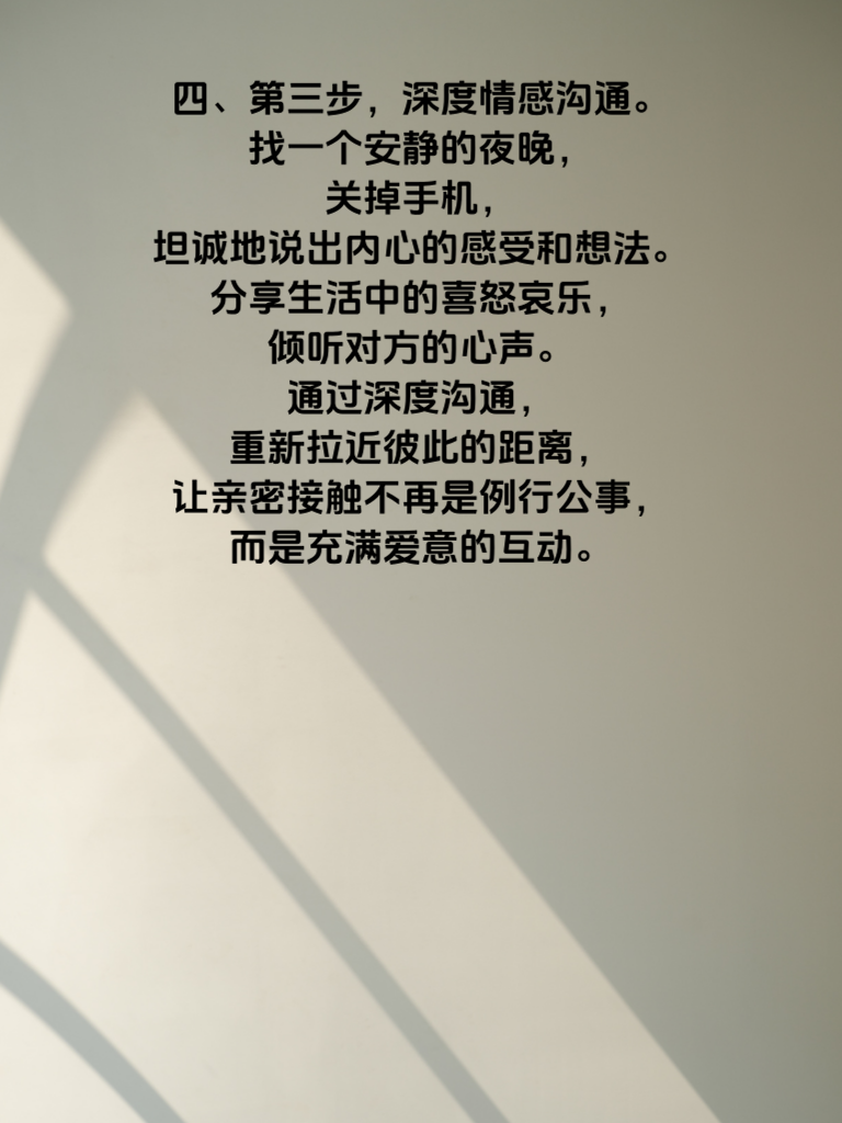 一、当亲密接触变成例行公事,感情似乎也陷入了一种平淡的泥沼。曾经的心动与激情渐渐远去,剩下的只是机械般的重复动作。然而,别让爱就此沉睡,拯救感情的机会就在眼前。 二、第一步,重新点燃好奇心。回忆最初在一起时,那些让彼此心动的小细节。比如第一次约会的餐厅,当时的氛围和心情。再次走进那家餐厅,点上曾经一起吃过的美食,唤起心底的那份好奇与期待。 三、第二步,制造专属仪式感。可以是每个月固定的一次短途旅行,或是每周一次的浪漫晚餐。在这些特别的时刻,精心准备,用心交流,让彼此感受到爱从未褪色。 四、第三步,深度情感沟通。找一个安静的夜晚,关掉手机,坦诚地说出内心的感受和想法。分享生活中的喜怒哀乐,倾听对方的心声。通过深度沟通,重新拉近彼此的距离,让亲密接触不再是例行公事,而是充满爱意的互动。