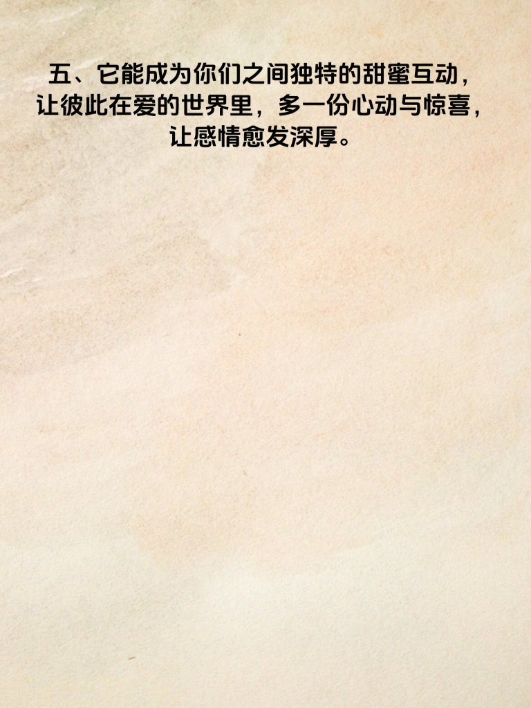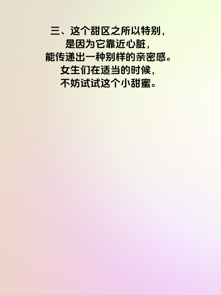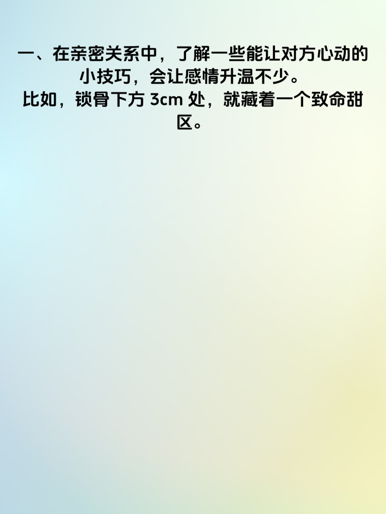 一、在亲密关系中,了解一些能让对方心动的小技巧,会让感情升温不少。比如,锁骨下方3cm处,就藏着一个致命甜区。 二、当你轻轻亲吻这个地方时,往往能给对方带来意想不到的触动。男生们可要记住啦,这可能会让她瞬间缴械投降哦。 三、这个甜区之所以特别,是因为它靠近心脏,能传递出一种别样的亲密感。女生们在适当的时候,不妨试试这个小甜蜜。 四、不过要注意,使用这个小技巧时,氛围要恰到好处。在温馨浪漫的环境里,轻轻落下一吻,效果更佳。 五、它能成为你们之间独特的甜蜜互动,让彼此在爱的世界里,多一份心动与惊喜,让感情愈发深厚。