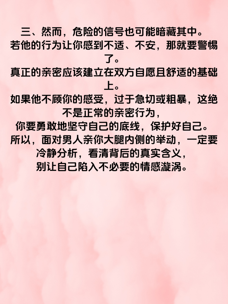 一、男人亲你大腿内侧,这一行为背后可能藏着多种含义。首先是浪漫。当他怀着满满的爱意与尊重,轻轻亲吻此处,那是他对你深情的表达。他渴望用这种温柔且私密的方式,让你感受到他内心深处对你的珍视,仿佛在诉说着你于他而言无比重要。 二、调情也是常见的一种含义。他或许带着些许俏皮与性感,通过这个举动来挑起你的情绪,营造暧昧的氛围。这时候的亲吻,是他在向你传递一种信号,暗示着你们之间有着别样的情愫在悄然蔓延。 三、然而,危险的信号也可能暗藏其中。若他的行为让你感到不适、不安,那就要警惕了。真正的亲密应该建立在双方自愿且舒适的基础上。如果他不顾你的感受,过于急切或粗暴,这绝不是正常的亲密行为,你要勇敢地坚守自己的底线,保护好自己。所以,面对男人亲你大腿内侧的举动,一定要冷静分析,看清背后的真实含义,别让自己陷入不必要的情感漩涡。