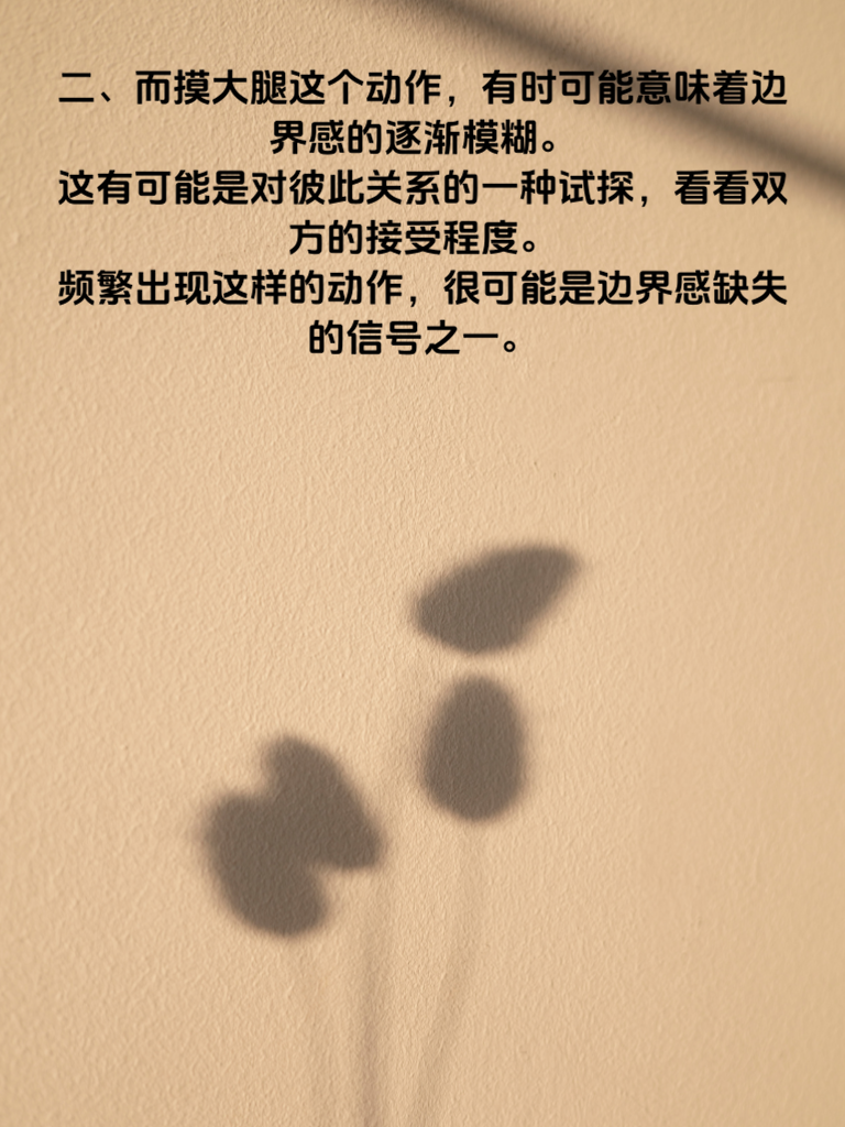 一、在男女相处中,一些细微动作往往暗藏心理信号。比如摸脖子和摸大腿,看似平常,实则能反映很多问题。摸脖子可能暗示着内心的紧张与不安,也许在当下情境中,对方感到有些局促,试图通过这个动作来舒缓情绪。 二、而摸大腿这个动作,有时可能意味着边界感的逐渐模糊。这有可能是对彼此关系的一种试探,看看双方的接受程度。频繁出现这样的动作,很可能是边界感缺失的信号之一。 三、边界感缺失还可能有其他表现。比如过度亲昵的举动,未经允许就进入对方私人空间等。当出现这些情况时,我们要警惕,这可能影响到彼此关系的健康发展。 四、对于男生来说,追求女生时要注意把握好度。尊重对方的边界,通过合适的方式增进感情。如果发现女生有边界感缺失的信号,要及时沟通,了解她的想法,共同维护健康的情感关系。 五、女生也要留意自己和对方的行为。若察觉到边界感出现问题,坦诚交流是关键。只有双方都重视边界,才能让感情在合适的轨道上稳步前行,收获美好的爱情体验。