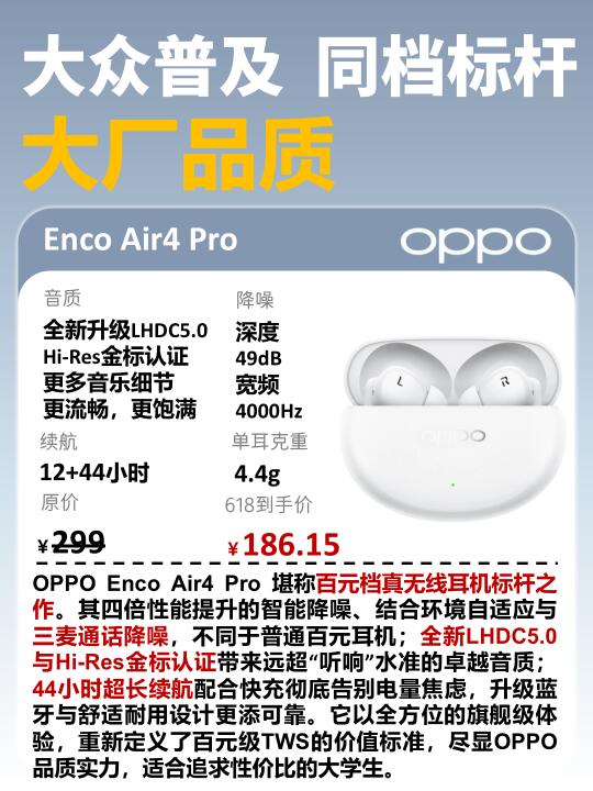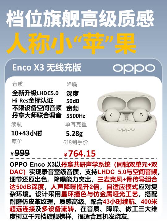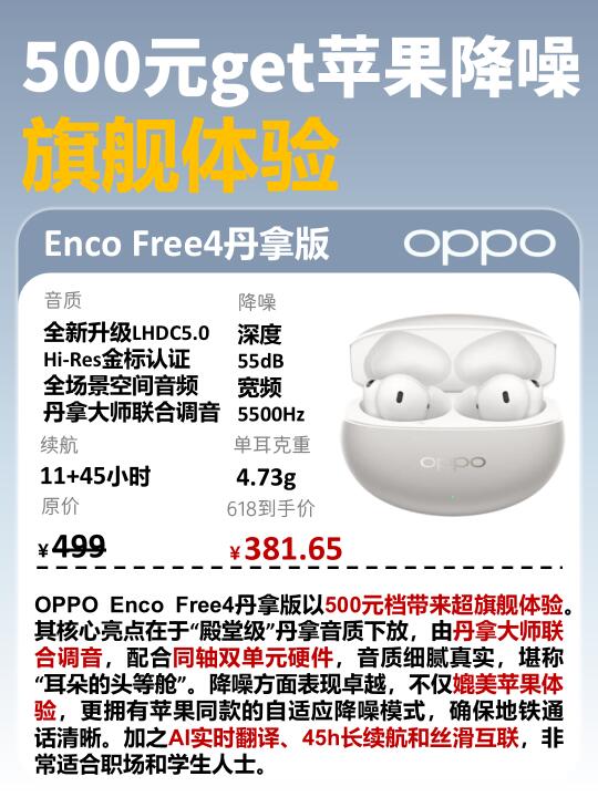 🔥是不是还有宝子618在纠结耳机怎么选?不慌!有七七在!OPPO这三款降噪耳机真的可以闭眼入!从入门到旗舰,总有适合你的,到手价真香到哭! 选择降噪耳机无非看这几点:首先是音质,好音质耳机带来全新体验,优选带金标认证和有LHDC 5.0的,丹拿音效和空间音效是加分项;其次是降噪能力,主要看降噪深度和降噪宽频,数值越大降噪效果越明显。 第三是续航能力,降噪耳机续航时间>40h为宜,降噪模式下需达20h,如果支持无线充电或者快充更好;第四个就是蓝牙协议,好的蓝牙等级,手机耳机隔400m都不会断,轻便性(长时间佩戴无负担)和防水等级(出汗在所难免)也是重要的参考因素 综合以上因素,七七给大家推荐三款性价比超高的降噪耳机,总有一款适合你的: 1⃣ OPPO Enco Free4 丹拿版 - 500元档性价比超高! 原价¥499 → 618到手¥381.65! 殿堂级丹拿音质 + 同轴双单元,耳朵的[萌萌哒R]认证 55dB深度+5500Hz宽频降噪,“安卓超强人声降噪”,地铁通话也清晰!45h超长续航+400米超远蓝牙,职场/学生党通勤神器!单耳仅4.73g,佩戴超舒适!💰500元档拿下超旗舰体验,冲就对了! 2⃣ OPPO Enco X3 无线充版 - 千元档质感超赞! 原价¥999 → 618到手¥764.15! 丹拿共研声学系统,录音室级音质!LHDC 5.0 + 空间音频,细节拉满!50dB深度+5500Hz宽频降噪,自适应模式+人声降噪提升2倍!星环撞色+仿金属哑光+仿皮革纹理,高级质感拿捏!颜值党闭眼入!43h续航+多设备流转,发烧友的心头。 3⃣ OPPO Enco Air4 Pro - 百元档普及! 原价¥299 → 618到手¥186.15! 百元档降噪,四倍性能提升智能降噪+环境自适应,告别噪音!全新LHDC5.0 + Hi-Res金标认证。44h超长续航+快充,电量焦虑?不存在的!单耳仅4.4g,佩戴无感升级!大厂品质重新定义百元TWS,学生党冲! 💡总结: 要音质降噪双绝+性价比:选 Free4 丹拿版! 追求超赞音质、降噪、质感:选 X3 无线充版! 预算有限也要好体验:Air4 Pro 闭眼入! 🎁618到手价是真划算,错过等一年!OPPO品质+旗舰技术下放,选哪款都不亏!快去电商平台加购吧!👇