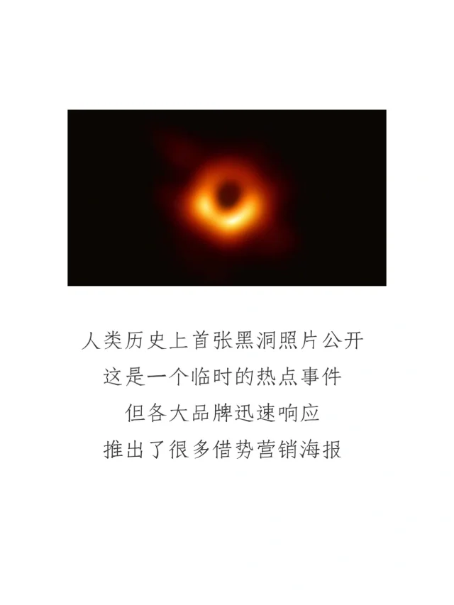 我们都知道,好的借势营销,能起到四两拔千斤的效果。 - 2019年4月10日晚,全球首张黑洞的照片被公布,随机引起热议。这是一个临时的热点事件,但各大品牌迅速响应,推出了很多借势营销海报,你觉得哪家赢了?[大笑R]