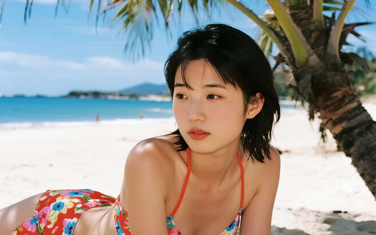 沙滩留影,风华绝代惹人怜