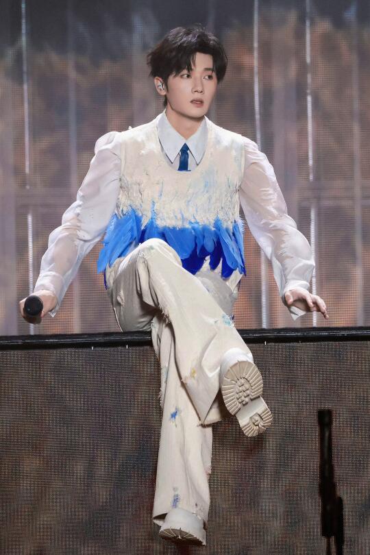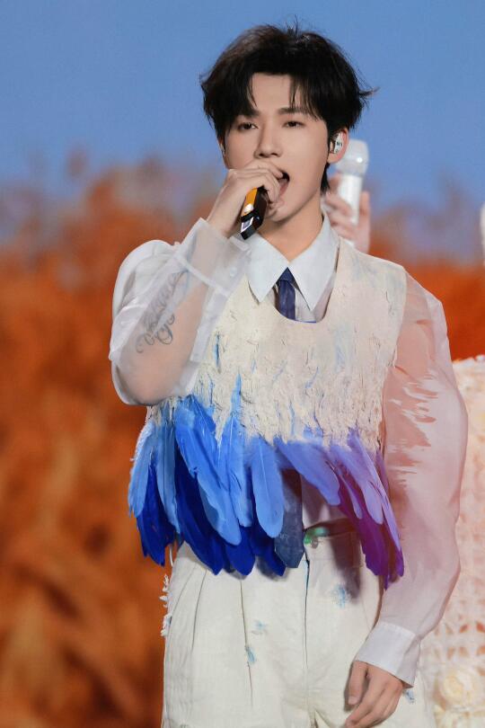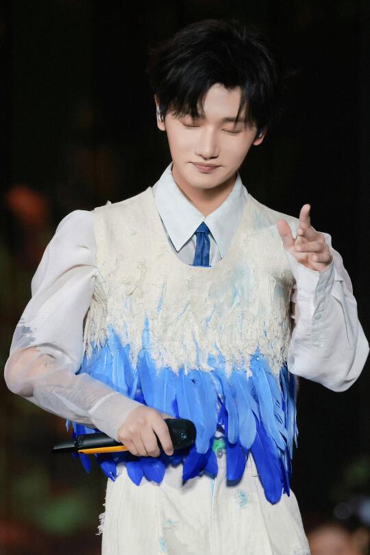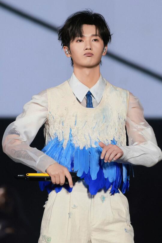 🔷十個勤天演唱會南寧站 穿了我設計的衣服,外面那套🔹米色牛仔磨毛漸變藍色羽毛背心 和 彩色破洞牛仔 是25fw歺「è」系列, 💙哈哈,可以若隱若現紋身的內搭在圖6~8,局部透明襯衫 來自23FW㐂「xǐ」系列 💙哈哈美膩的孔雀豪,圖1的站姿好帥呀「首圖重新編輯了好幾回,還是決定現在這張放在首圖,真的很優越的身姿😭」 💙圖片來自/Nang馕_蔣敦豪