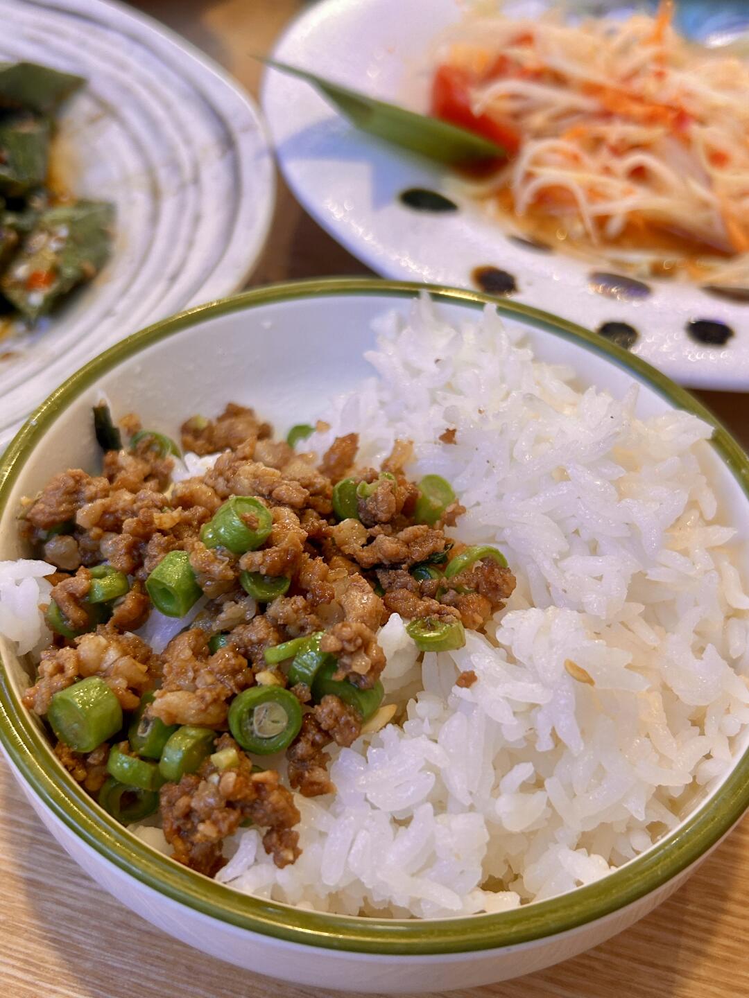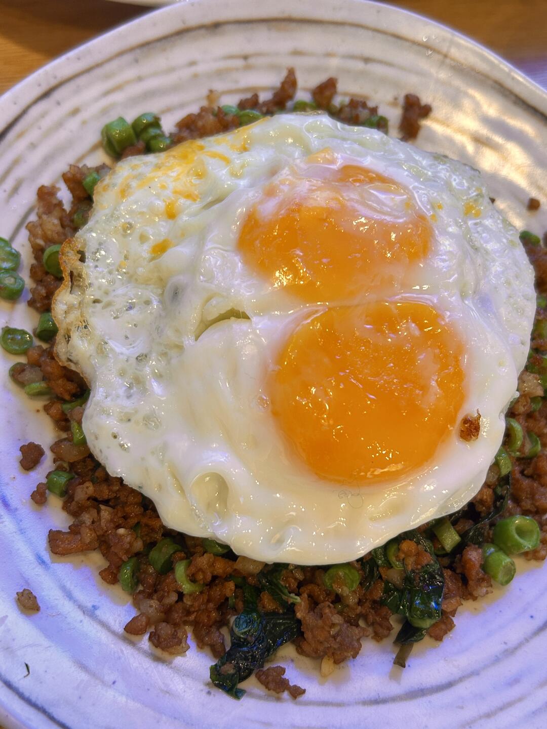 ⭐️金不换炒肉碎:豆角、肉沫和橄榄菜混合在一起,拿来拌饭也不错,很下饭,上面还卧了个双黄蛋🤩