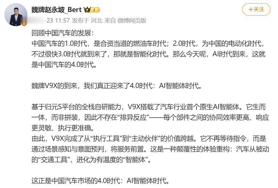 中国汽车工业的主流发展路径,正从“模式与流量的创新”,迈向“核心科技与系统能力的创新”。魏牌V9X所代表的4.0时代,其内核是将车变为安全无忧、品质可靠的AI智能体,它不再满足于在即有的游戏规则中成为优秀选手,而是致力于参与甚至重写规则本身。