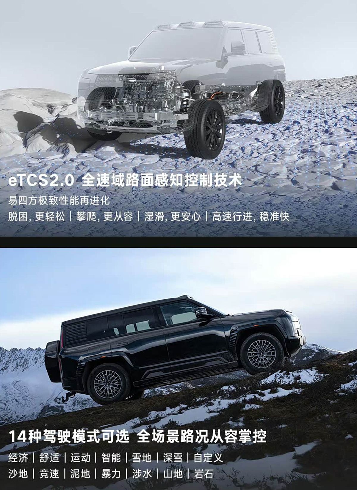 搭配“易四方”动力系统,即四轮由四个电机独立驱动,且每个电机都可以独立控制单个车轮,综合功率880千瓦,综合扭矩1280牛·米,强大的动力不但可以应对越野路况,在公路驾驶也是优势尽显,其0-100km/h仅需要3.6秒。