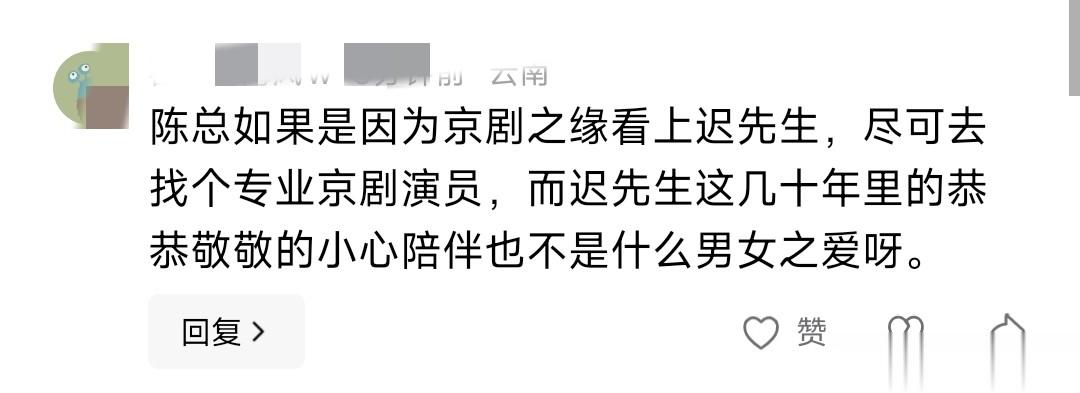 还有网友说,觉得陈总要是因为京剧看上迟先生,大可以找专业京剧演员,迟先生几十年恭恭敬敬的小心陪伴,算不上什么男女之间的爱慕之情。我觉得这话戳破了关系里的界限感,迟先生的陪伴更偏向敬重与守护,和男女情爱确实是两码事。