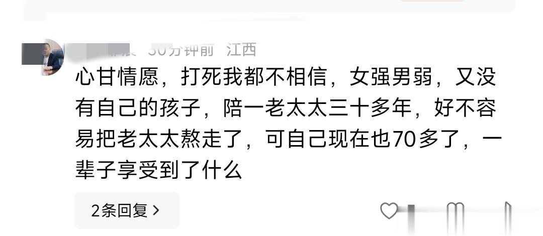 有网友说,直言不相信这种“女强男弱”的关系,男方没自己孩子,陪了老太太三十多年,好不容易熬走了,自己都七十多了,一辈子也没享受到什么。我觉得这感慨里全是对付出与回报不对等的无奈,一辈子守着一段没太多温情回馈的关系,确实挺让人唏嘘的。