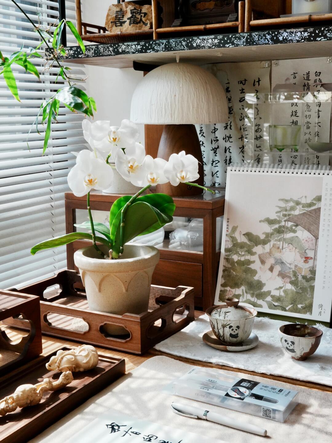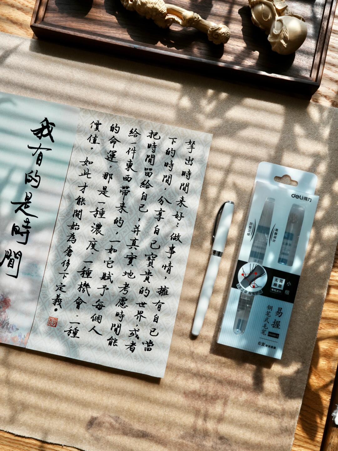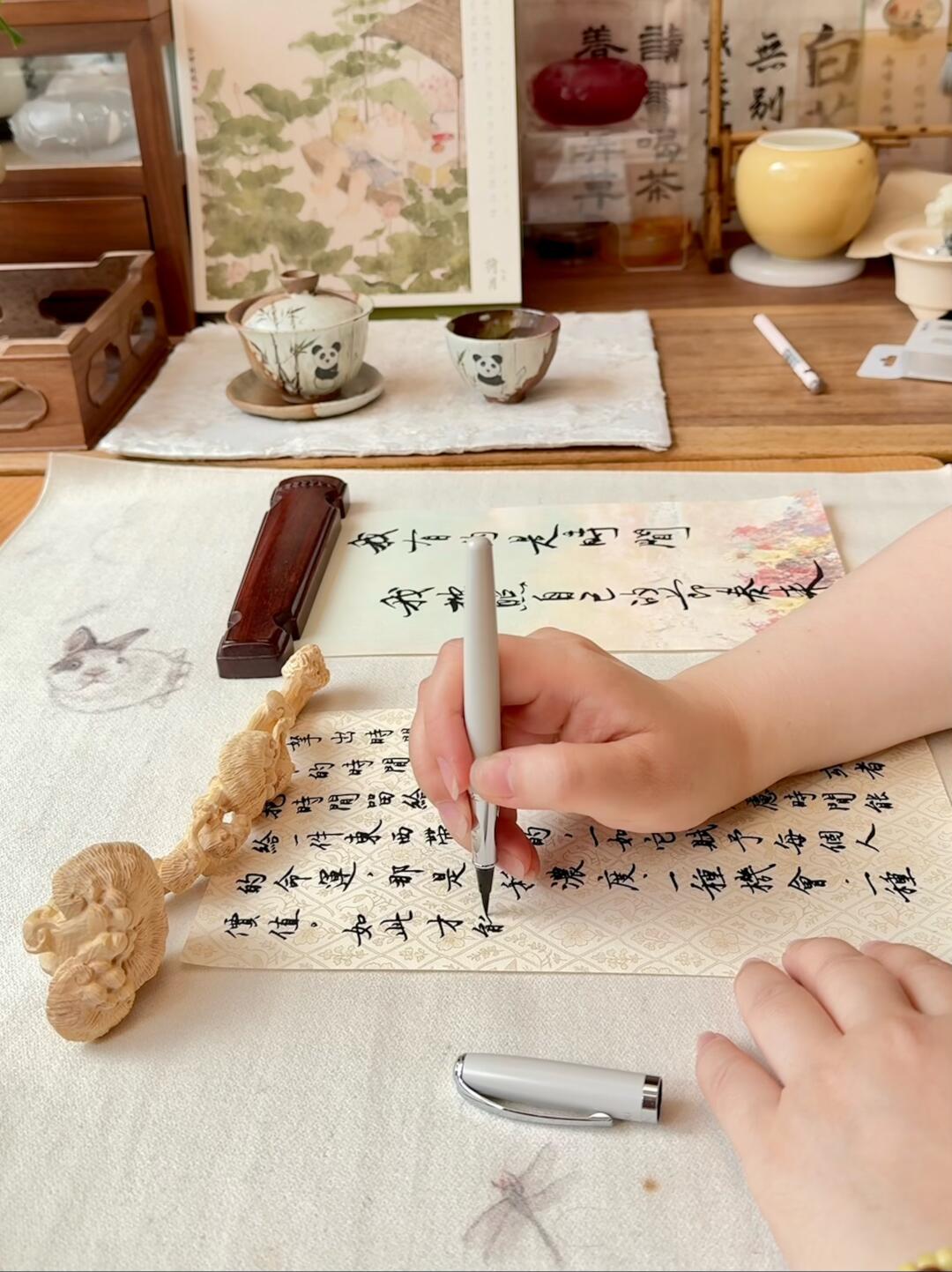 一张用心整理过的书桌,摊开的纸页,一支打开笔盖就能书写的毛笔,都能让浮躁的心沉静下来,回归专注。