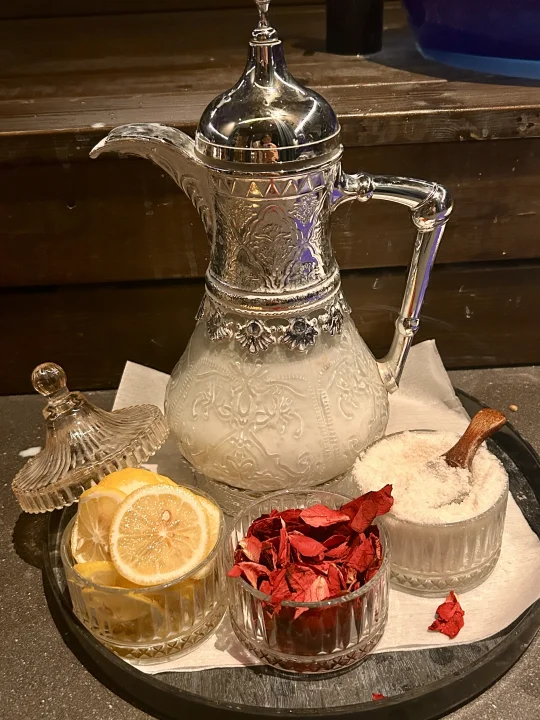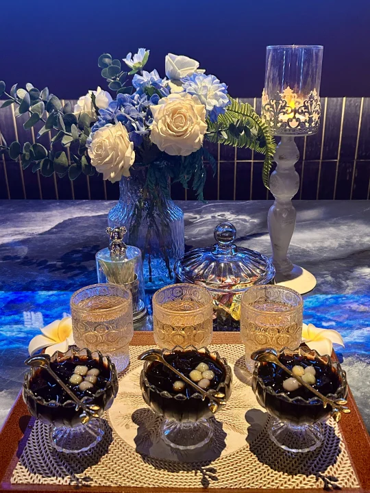 第一步净足:先用加了牛奶🥛和玫瑰花🌹水泡脚,然后用浴盐和柠檬🍋擦洗脚底。