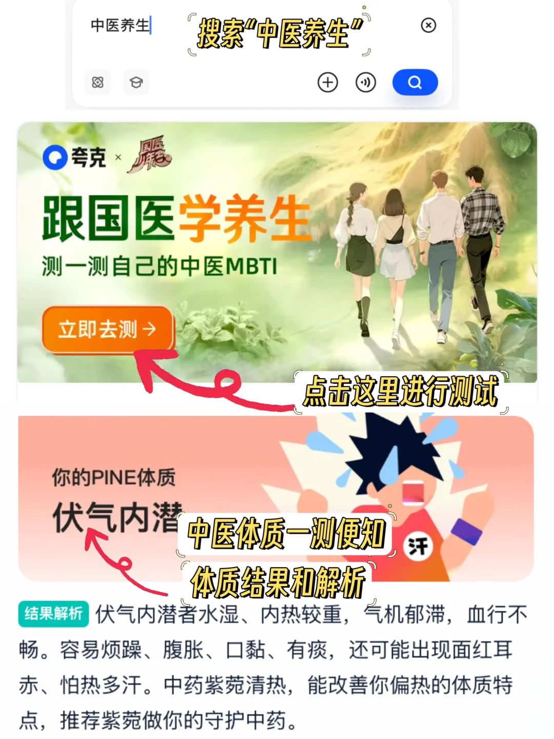 👉看完才知道,鼻炎其实和你当下身体的体质有密切联系。在节目里,看到夏之光用夸克🌟自测自己的中医体质,我试了一下,直接搜【中医养生】在家就能免费测,结果测出我是“痰热内生”,夸克不仅给出了详细的体质分析报告,还能根据你的体质定制个性化的养生方案,特别实用!