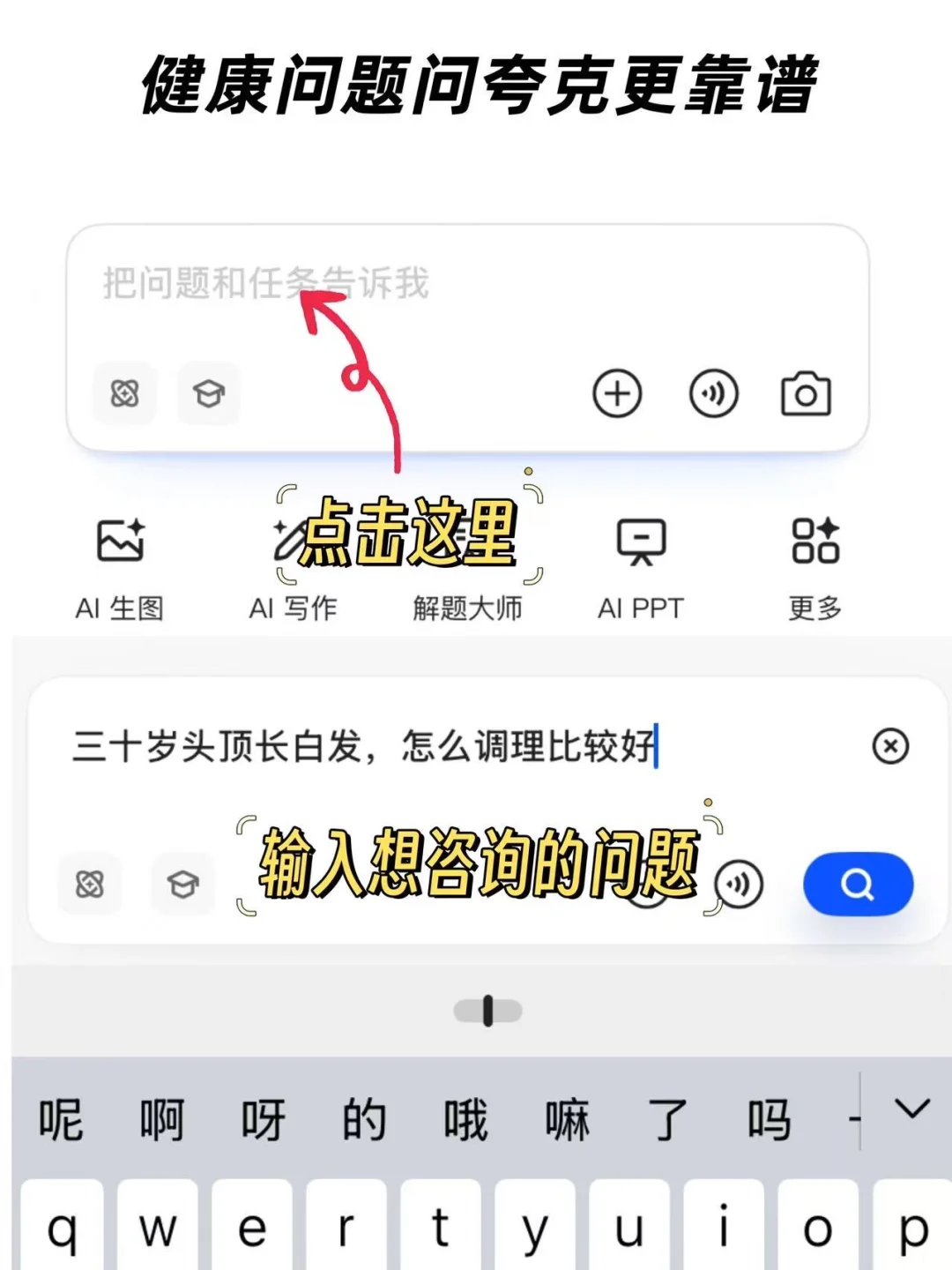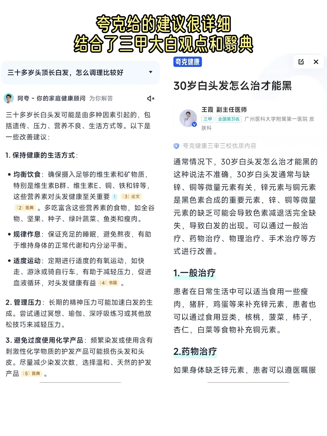 👉老公有白发困扰,在夸克上面也找到了对应的调理建议,都是参考三甲大白观点和专业医典的,权威可信,真不愧是《国医少年志》指定的AI健康助手!
