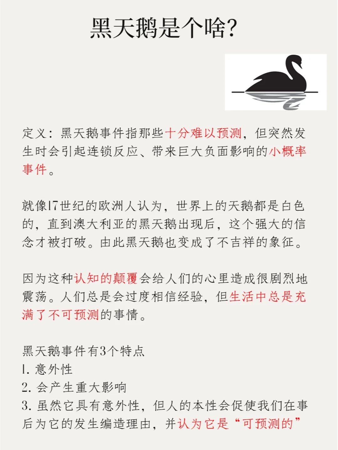 黑天鹅事件指那些十分难以预测,但突然发生时会引起连锁反应、带来巨大负面影响的小概率事件。