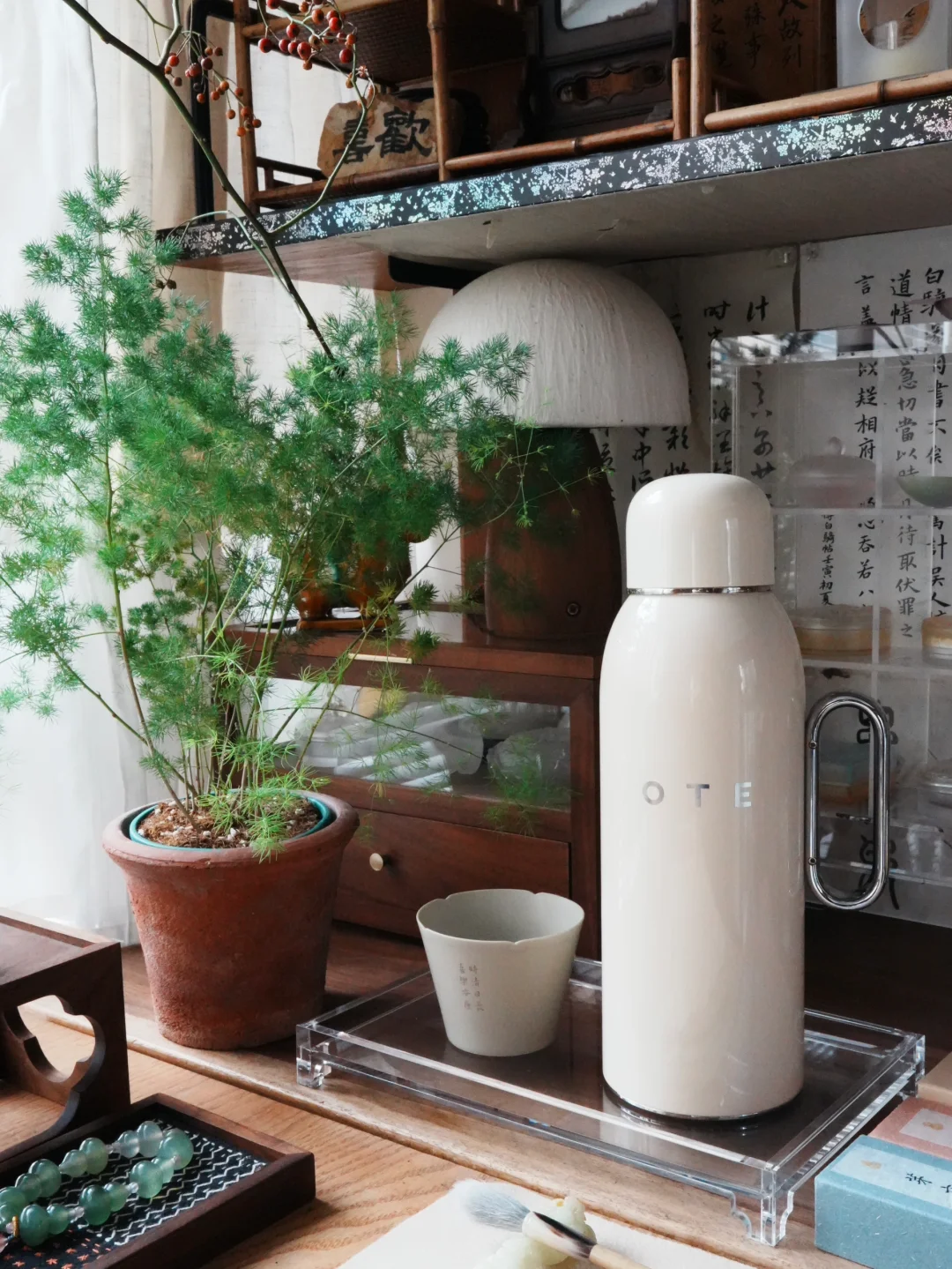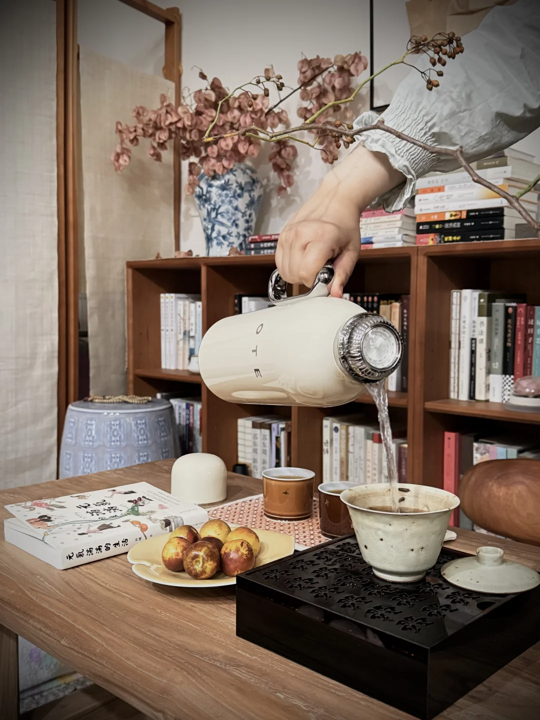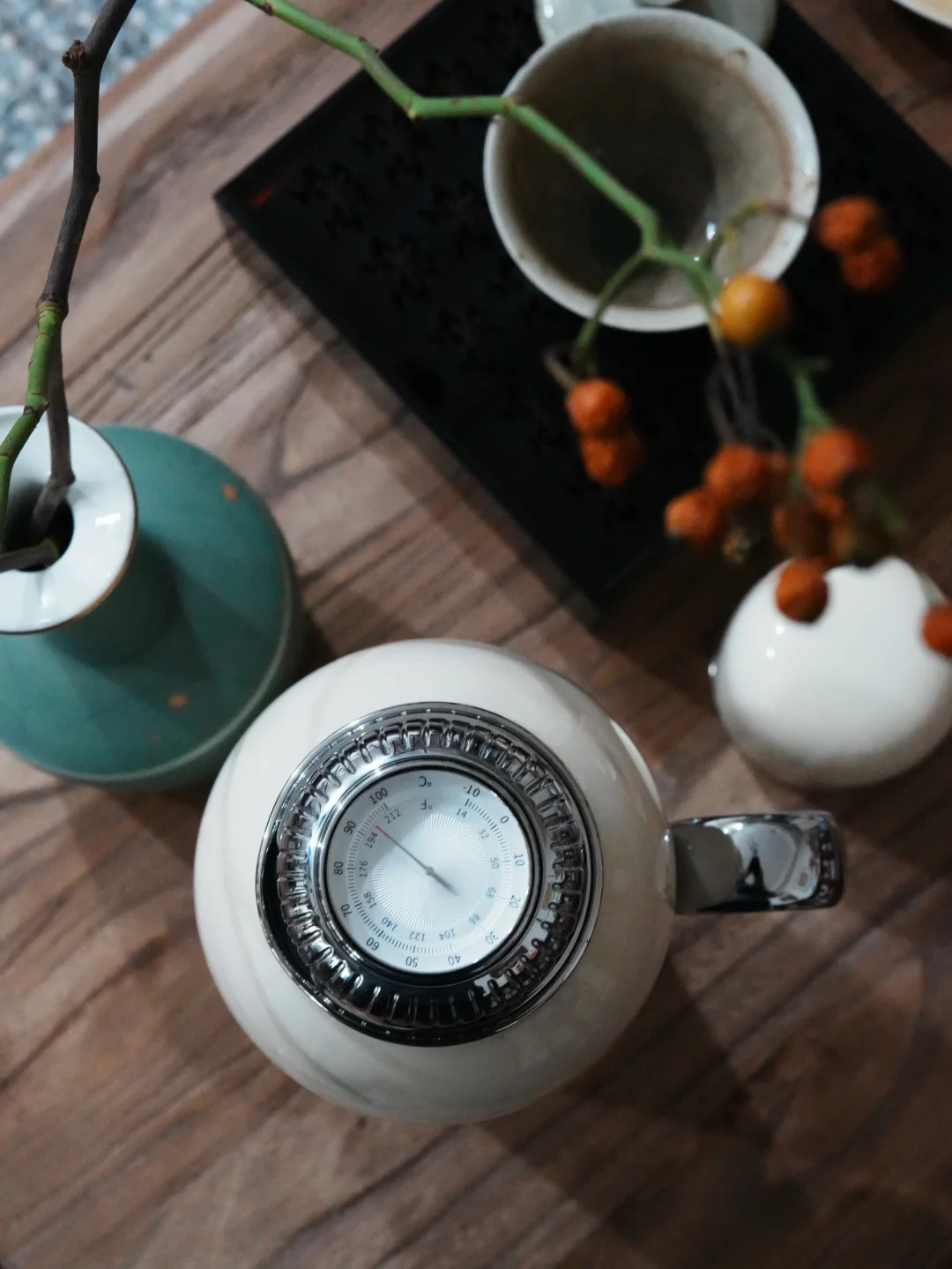 奶白色的保温壶,仿佛是从《罗马假日》里走出来的优雅存在,圆润的瓶身搭配金属手柄,温度显示表盘质感十足。