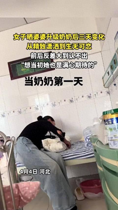 再看看那两套对比照。第一天的照片里,婆婆妆容精致,穿着讲究,笑容轻松。第三天的照片里,她素面朝天,头发随便用夹子别起来,穿着宽松的家居服,脸上的表情只剩疲惫。这不是摆拍,这是被婴儿“折磨”过的真实模样。