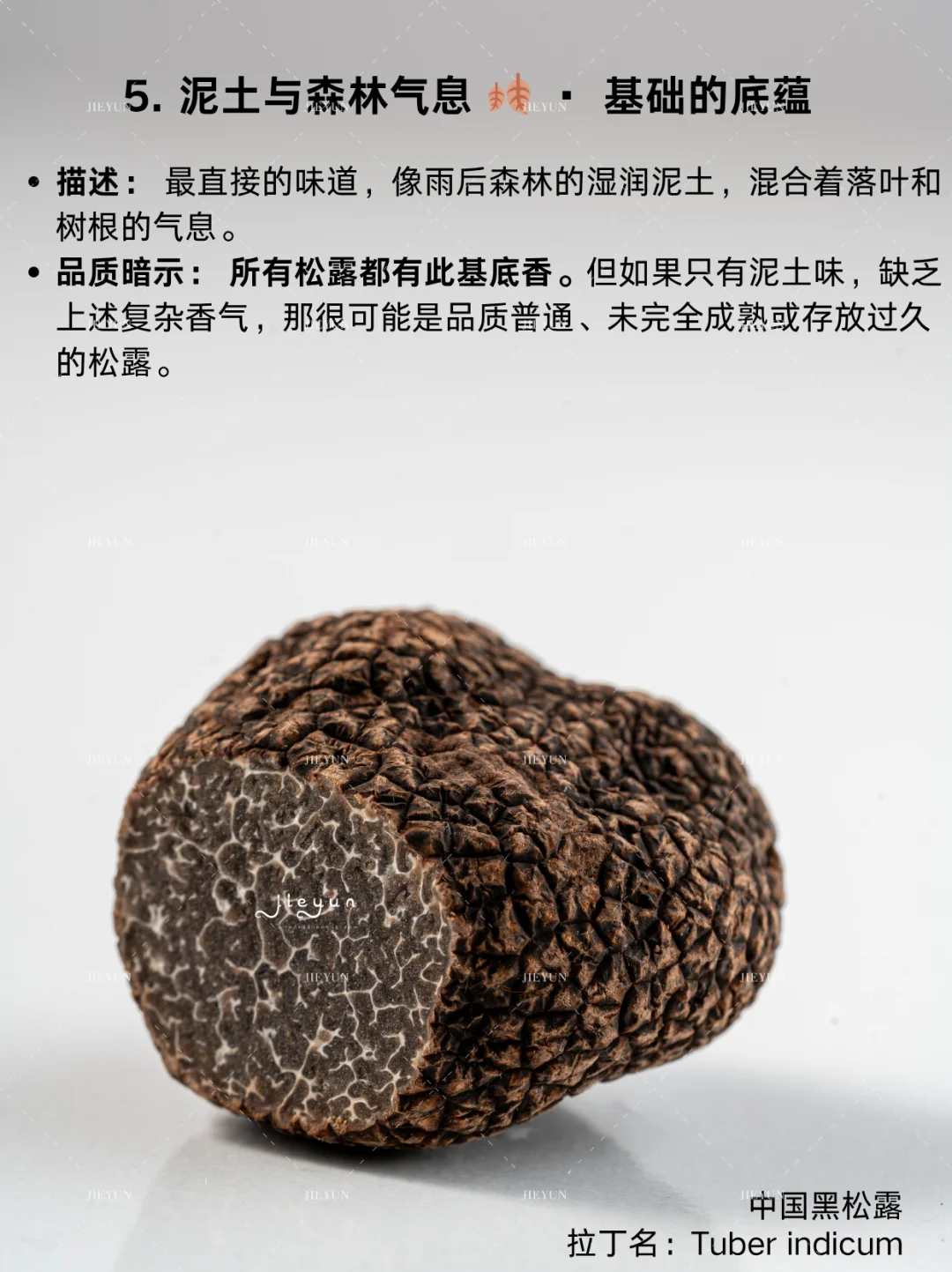 品质暗示: 所有松露都有此基底香。但如果只有泥土味,缺乏上述复杂香气,那很可能是品质普通、未完全成熟或存放过久的松露。