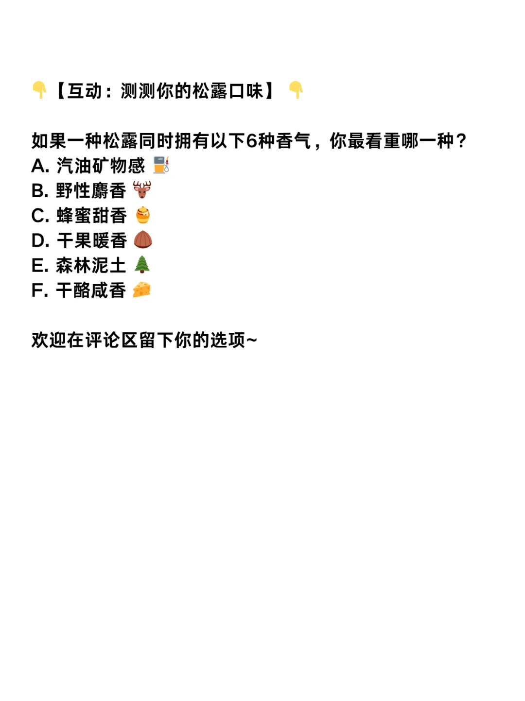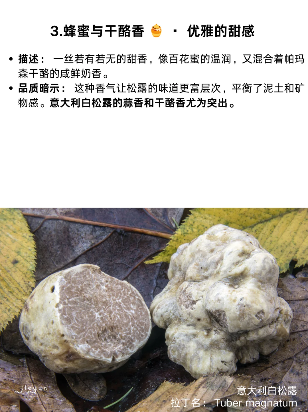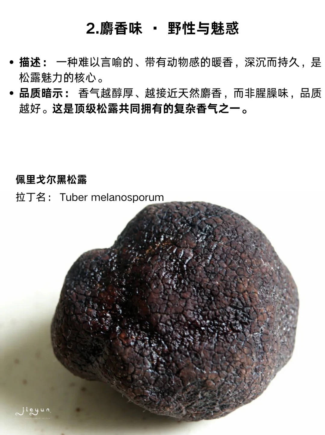 品质暗示: 香气越醇厚、越接近天然麝香,而非腥臊味,品质越好。这是顶级松露共同拥有的复杂香气之一。