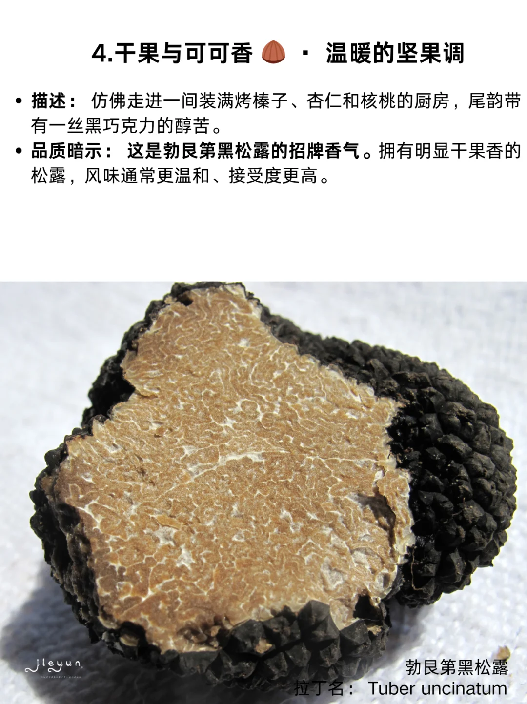 品质暗示: 这是勃艮第黑松露的招牌香气。拥有明显干果香的松露,风味通常更温和、接受度更高。