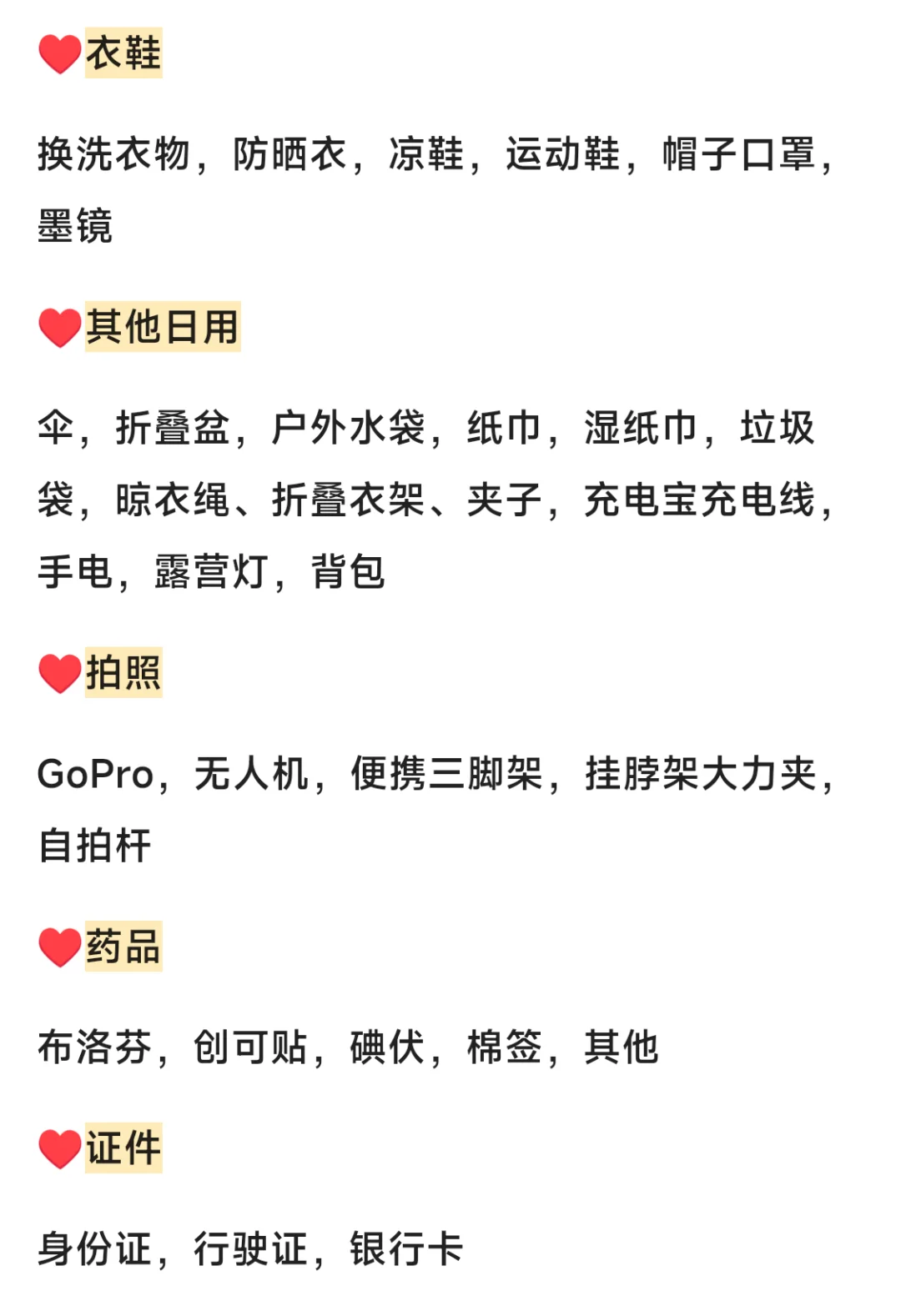 床车自驾旅行清单