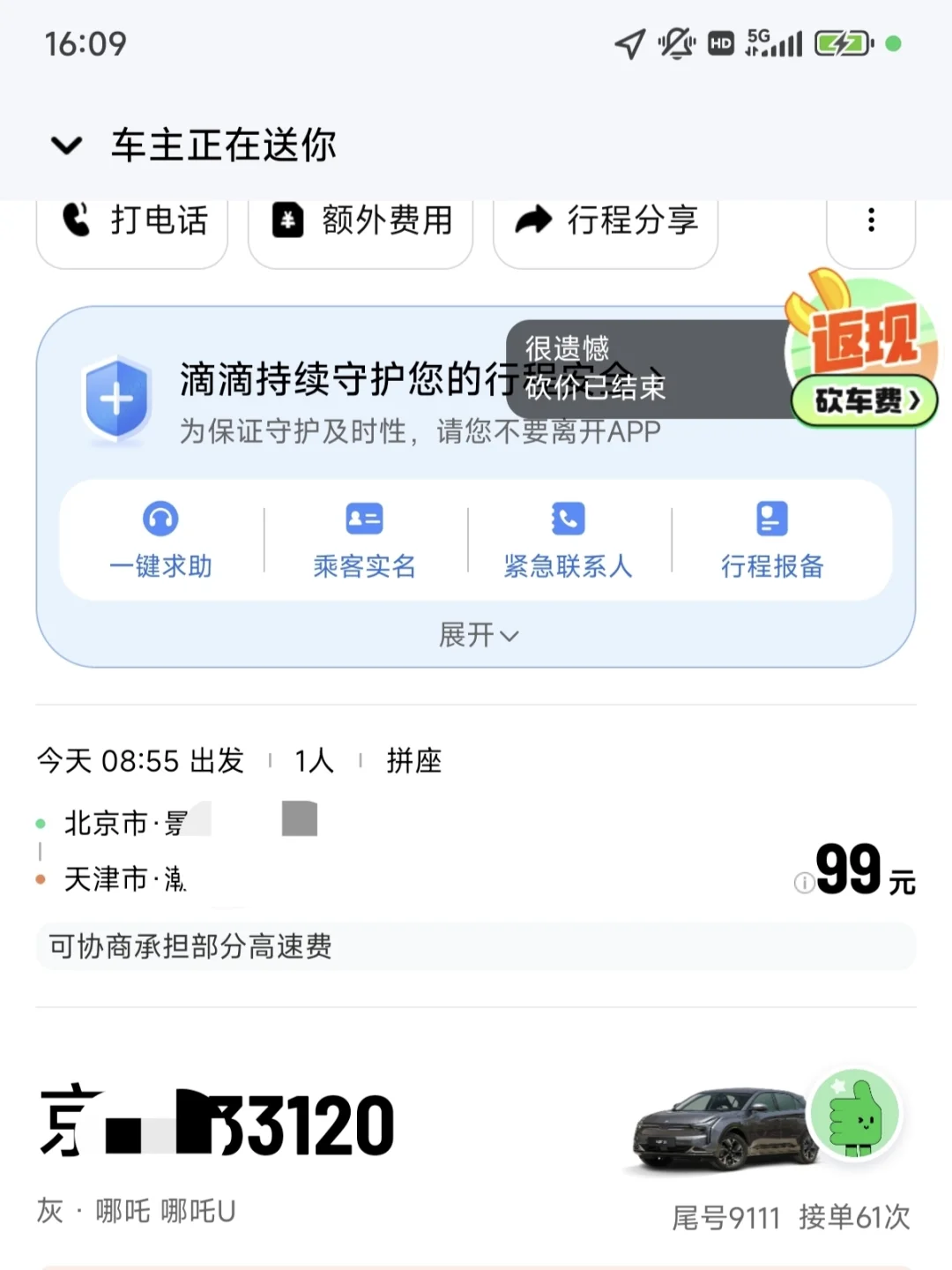 因为右手骨折没好,倒地铁坐高铁有点折腾,想着要不坐个顺风车吧。滴滴下单,有人接,于是把上午9点半的高铁票退了。