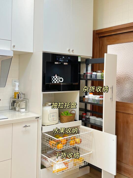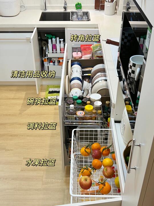 3⃣️地柜根据需要增加收纳拉篮,转角拉篮,碗碟拉篮,调料拉篮都很好用,改造成本2000💰