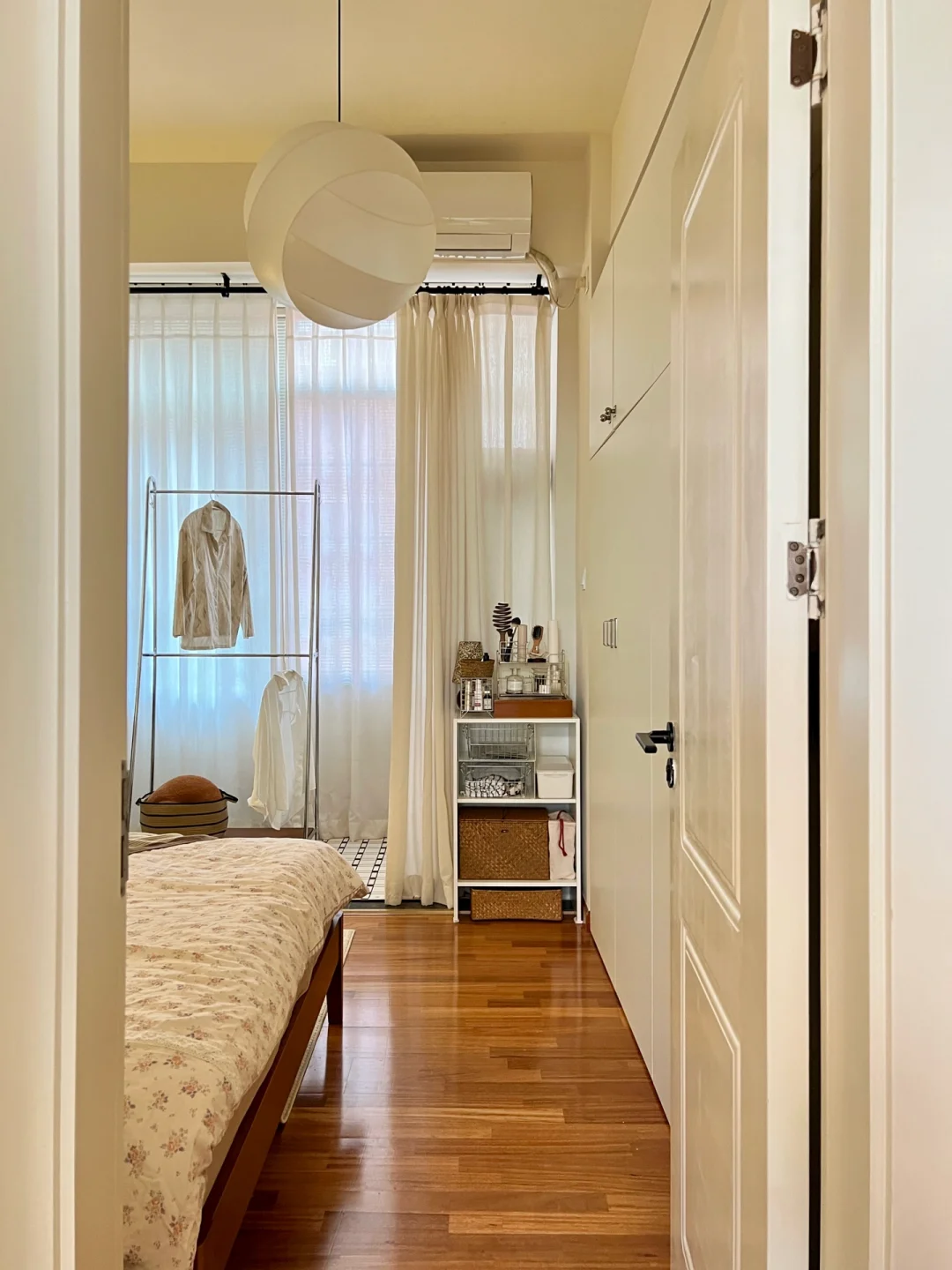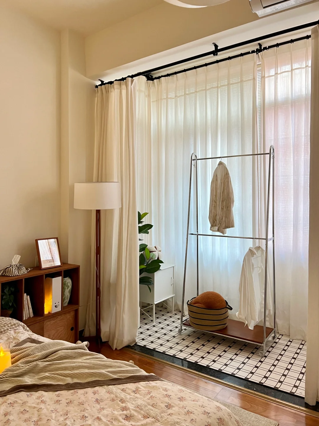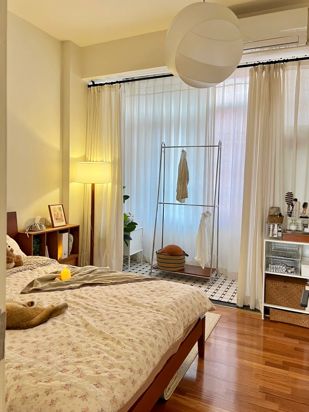 邻居说你真的好会改造! 不动硬装竟然可以把房间改成这样!太牛了吧✨ 我真的有改造超能力吧~阳台灰色丑丑的地砖,我定了块复古地垫,跟房间很搭,小小的复古感🍃 没有化妆桌,我就用50元的小柜子布置了一个护肤区,干干净净,放满了我的宝贝🌟 阳台空着,放了个衣架做次净衣区,隔夜衣服也有位置啦。 全靠软装的房间,你觉得还算ok吗💓