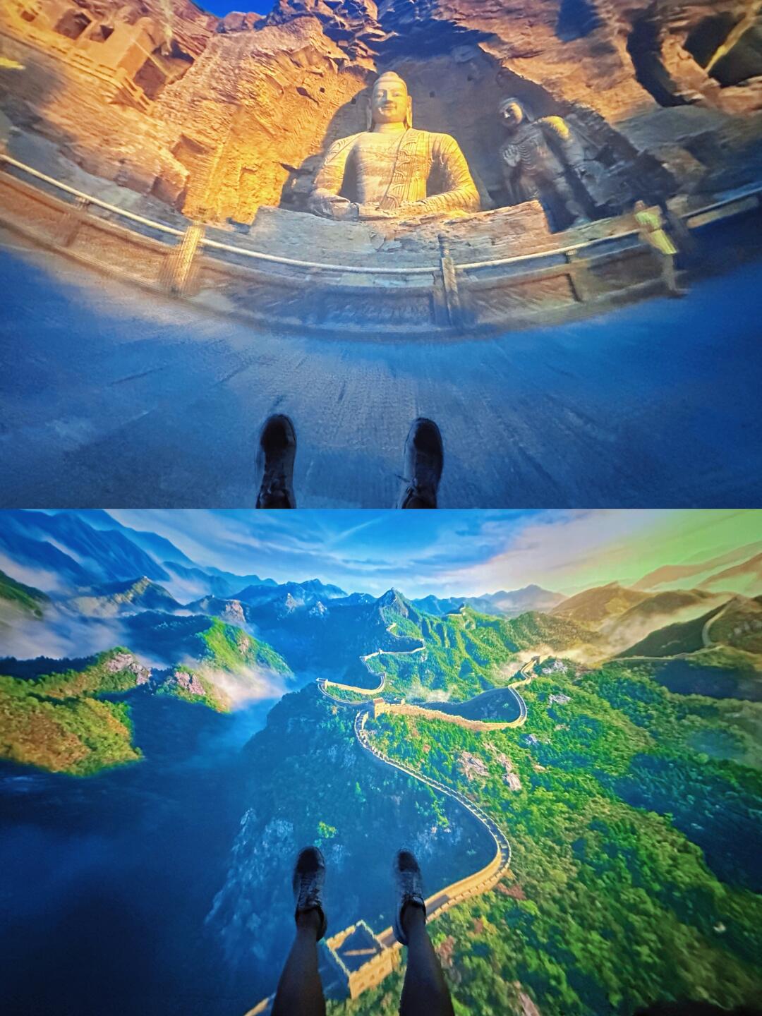 🌟飞越极限:这个项目一定要玩!坐在室内飞行影院中,飞越云冈石窟、壶口瀑布、悬空寺以及长城、张家界、香港维港等全国风光。