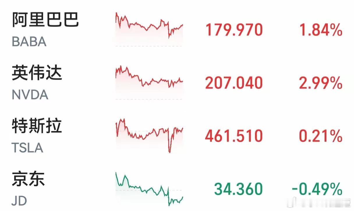 个股也是跌多涨少,但热门科技股依旧保持涨势,特斯拉上涨0.21%,英伟达大涨2.99%;中概股阿里巴巴大涨1.84%,京东下跌0.49%。