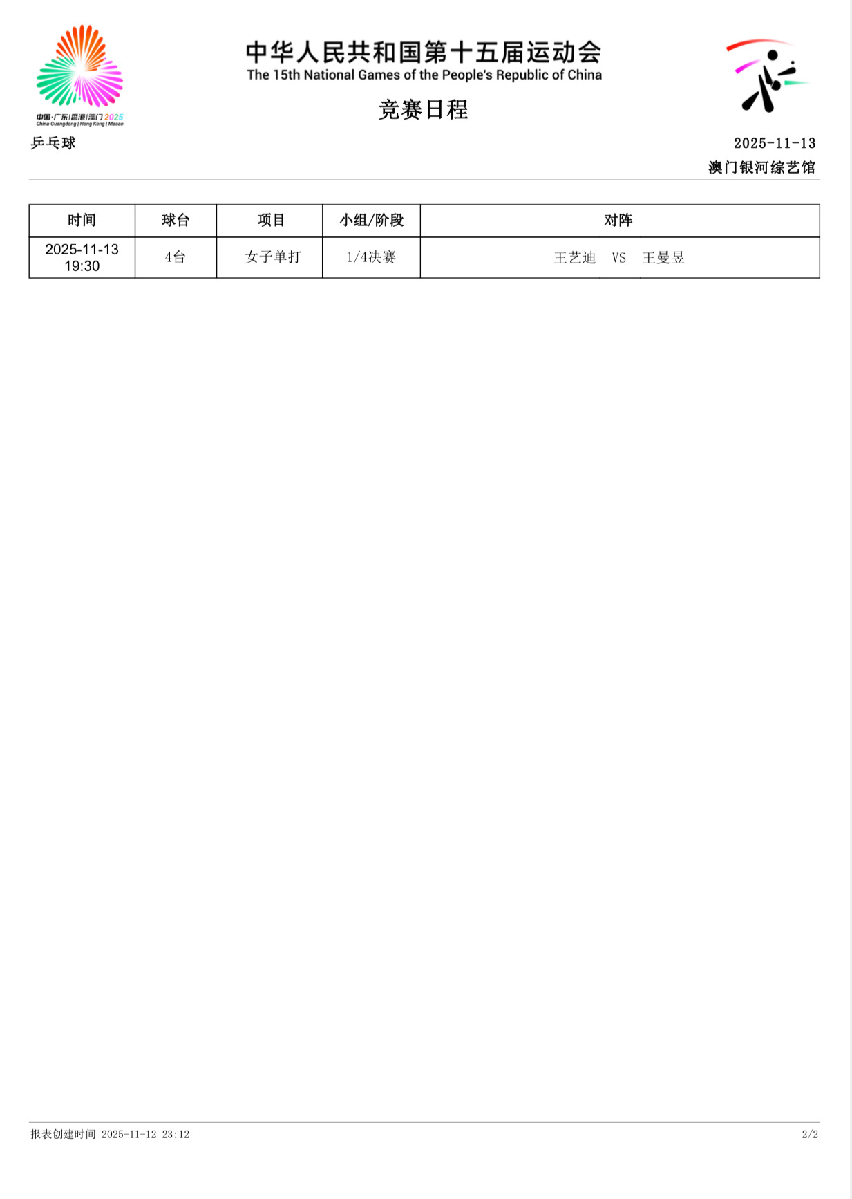 比赛安排:11月13日 19:30 T4王曼昱(黑龙江) VS 王艺迪(辽宁)